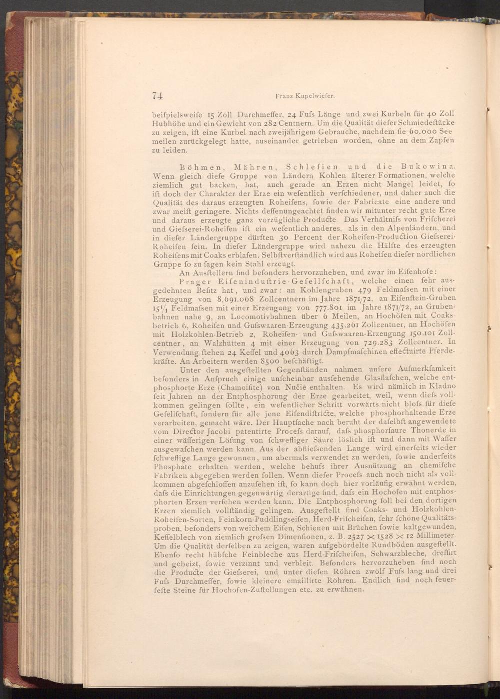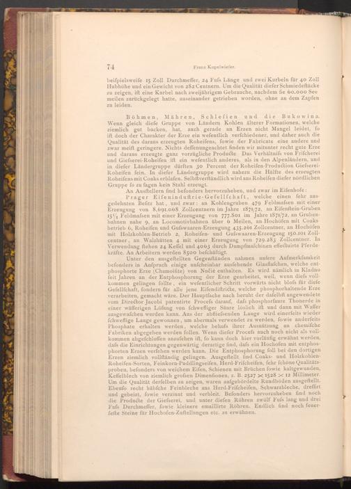 An Ausftellern find befonders hervorzuheben, und zwar im Eifenhofe: Prager Eifeninduftrie- Gefellfchaft, welche einen fehr ausgedehnten Befitz hat, und zwar an Kohlengruben 479 Feldmafsen mit einer Erzeugung von 8,691.068 Zollcentnern im Jahre 1871/72, an Eifenftein- Gruben 15 Feldmafsen mit einer Erzeugung von 777.801 im Jahre 1871/72, an Grubenbahnen nahe 9, an Locomotivbahnen über 6 Meilen, an Hochöfen mit Coaks betrieb 6, Roheifen und Gufswaaren- Erzeugung 435.261 Zollcentner, an Hochöfen mit Holzkohlen- Betrieb 2, Roheifen- und Gufswaaren- Erzeugung 150.101 Zollcentner, an Walzhütten 4 mit einer Erzeugung von 729.283 Zollcentner. In Verwendung ftehen 24 Keffel und 4063 durch Dampfmaschinen effectuirte Pferdekräfte. An Arbeitern werden 8500 befchäftigt.