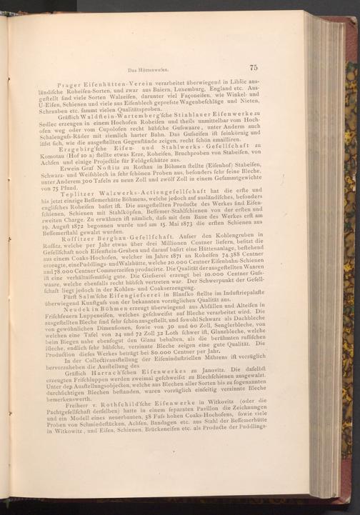 Teplitzer Walzwerks- Actiengefellfchaft hat die erfte und bis jetzt einzige Beffemerhütte Böhmens, welche jedoch auf ausländifches, befonders englifches Roheifen bafirt ift. Die ausgeftellten Producte des Werkes find Eifenfchienen, Schienen mit Stahlköpfen, Beffemer- Stahlfchienen von der erften und zweiten Charge. Zu erwähnen ift nämlich, dafs mit dem Baue des Werkes erft am 19. Auguft 1872 begonnen wurde und am 15. Mai 1873 die erften Schienen aus Beffemerftahl gewalzt wurden.
