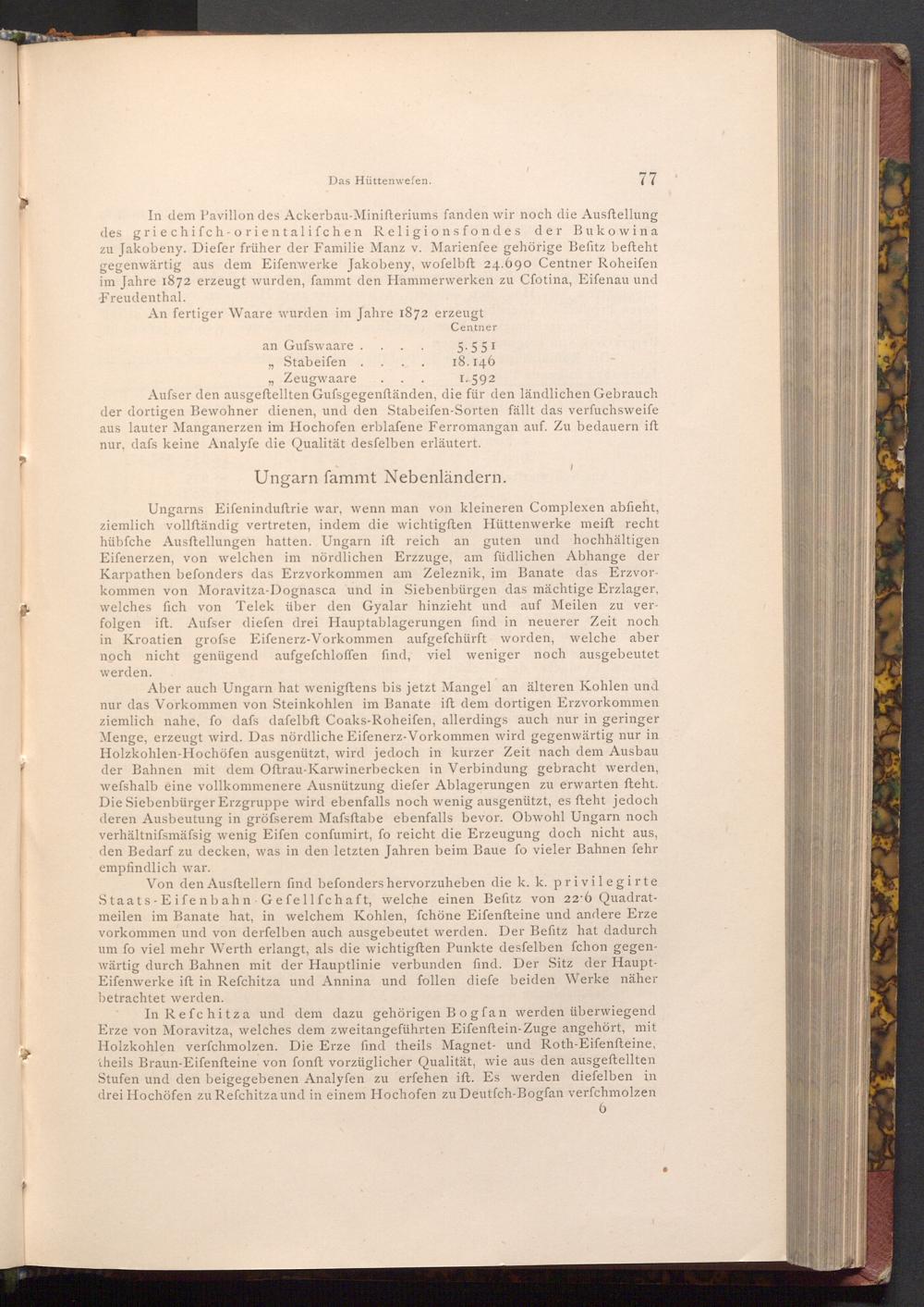 Ungarns Eifeninduftrie war, wenn man von kleineren Complexen abfieht, ziemlich vollſtändig vertreten, indem die wichtigften Hüttenwerke meift recht hübfche Ausftellungen hatten. Ungarn ift reich an guten und hochhältigen Eifenerzen, von welchen im nördlichen Erzzuge, am füdlichen Abhange der Karpathen befonders das Erzvorkommen am Zeleznik, im Banate das Erzvorkommen von Moravitza- Dognasca und in Siebenbürgen das mächtige Erzlager, welches fich von Telek über den Gyalar hinzieht und auf Meilen zu verfolgen ift. Aufser diefen drei Hauptablagerungen find in neuerer Zeit noch in Kroatien grofse Eifenerz- Vorkommen aufgefchürft worden, welche aber noch nicht genügend aufgefchloffen find, viel weniger noch ausgebeutet