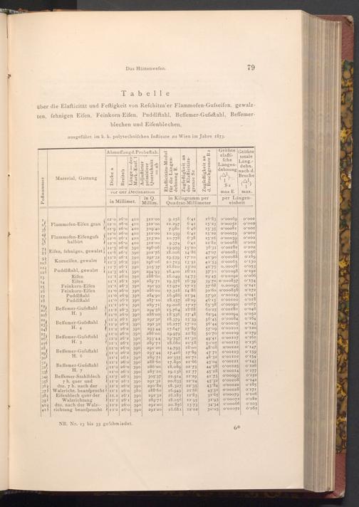 über die Elafticität und Feftigkeit von Refchitza'er Flammofen- Gufseifen, gewalzten, fehnigen Eifen, Feinkorn Eifen, Puddlftahl, Beffemer- Gufsftahl, Beffemerblechen und Eifenblechen,