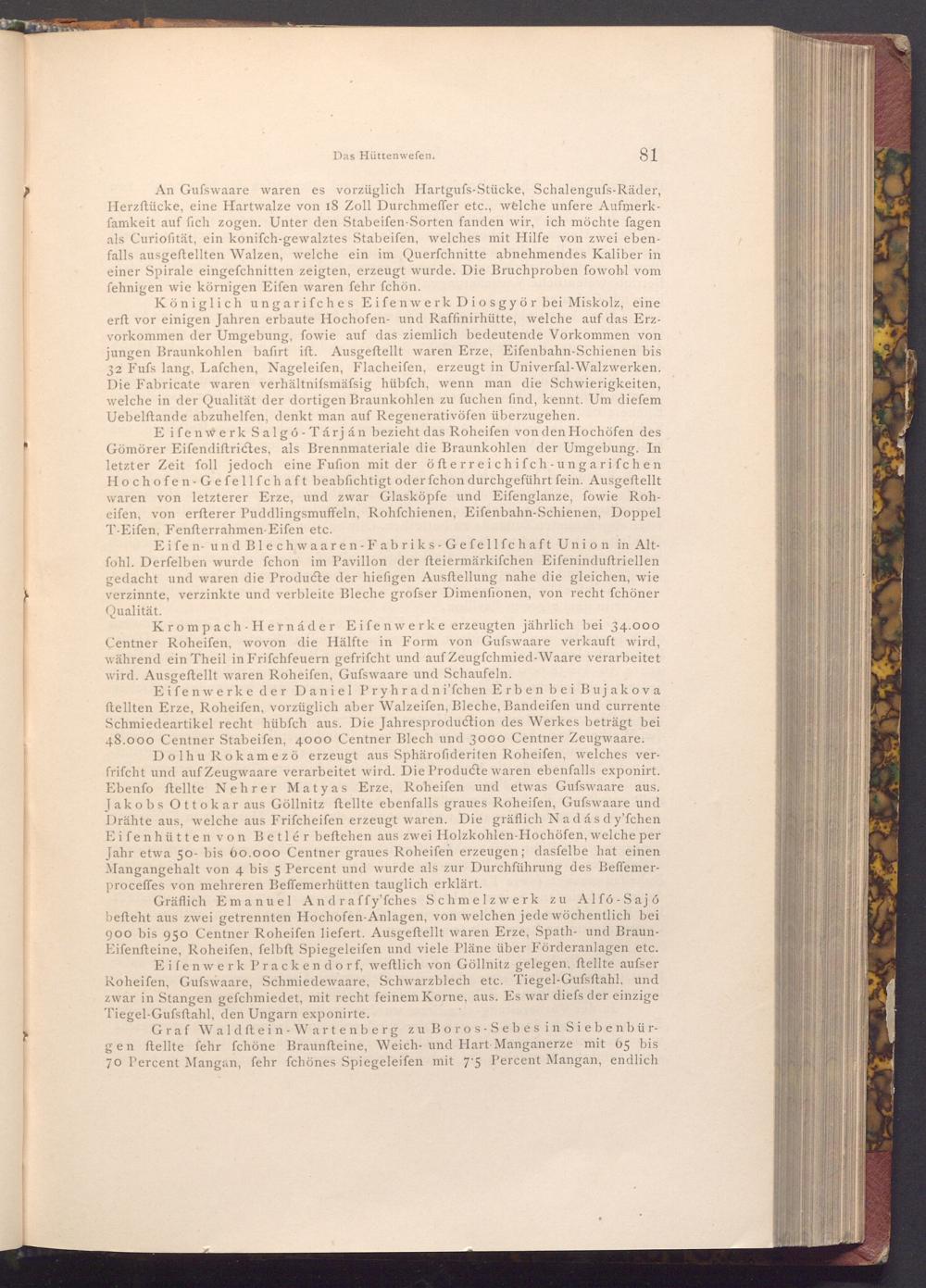 Dolhu Rokamezö erzeugt aus Sphärofideriten Roheifen, welches verfrifcht und auf Zeugwaare verarbeitet wird. Die Producte waren ebenfalls exponirt. Ebenfo ftellte Nehrer Matyas Erze, Roheifen und etwas Gufswaare aus. Jakobs Ottokar aus Göllnitz ftellte ebenfalls graues Roheifen, Gufswaare und Drähte aus, welche aus Frifcheifen erzeugt waren. Die gräflich Nadásdy'fchen Eifenhütten von Betlér beftehen aus zwei Holzkohlen- Hochöfen, welche per Jahr etwa 50- bis 60.000 Centner graues Roheifen erzeugen; dasfelbe hat einen Mangangehalt von 4 bis 5 Percent und wurde als zur Durchführung des Beffemerproceffes von mehreren Beffemerhütten tauglich erklärt.