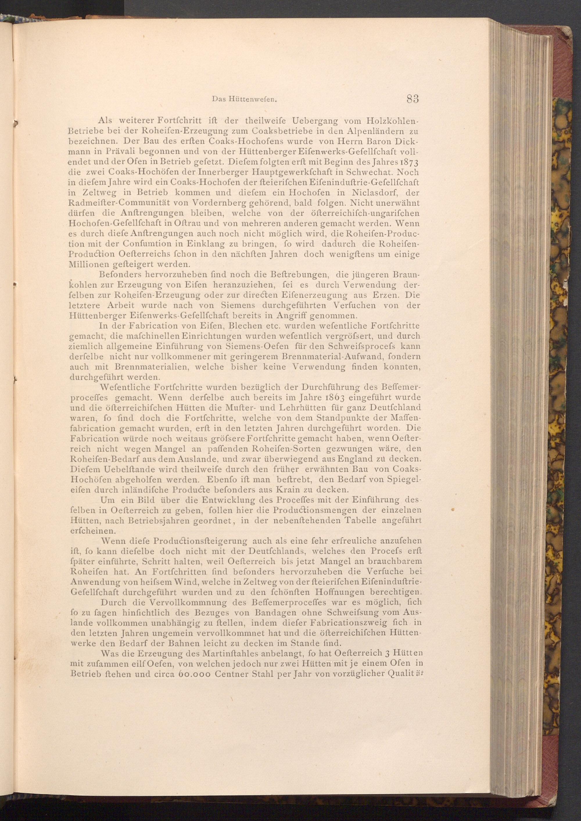 Wefentliche Fortfchritte wurden bezüglich der Durchführung des Beffemerproceffes gemacht. Wenn derfelbe auch bereits im Jahre 1863 eingeführt wurde und die öfterreichifchen Hütten die Mufter- und Lehrhütten für ganz Deutſchland waren, fo find doch die Fortfchritte, welche von dem Standpunkte der Maffenfabrication gemacht wurden, erft in den letzten Jahren durchgeführt worden. Die Fabrication würde noch weitaus gröfsere Fortfchritte gemacht haben, wenn Oefterreich nicht wegen Mangel an paffenden Roheifen- Sorten gezwungen wäre, den Roheifen- Bedarf aus dem Auslande, und zwar überwiegend aus England zu decken. Diefem Uebelftande wird theilweife durch den früher erwähnten Bau von CoaksHochöfen abgeholfen werden. Ebenfo ift man beftrebt, den Bedarf von Spiegeleifen durch inländifche Producte befonders aus Krain zu decken.