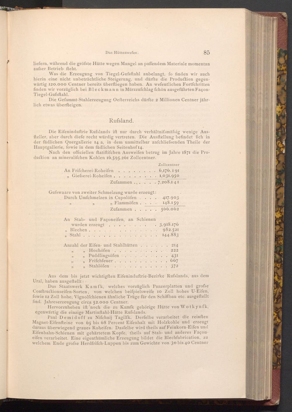 Paul Demidoff zu Nifchnij Tagilfk. Derfelbe verarbeitet die reinften Magnet- Eifenfteine von 65 bis 68 Percent Eifenhalt mit Holzkohle und erzeugt daraus überwiegend graues Roheifen. Dasfelbe wird theils auf Feinkorn- Eifen und Eifenbahn- Schienen mit gehärtetem Kopfe, theils auf Stab- und anderes Façoneifen verarbeitet. Eine eigenthümliche Erzeugung bildet die Blechfabrication, zu welchem Ende grofse Herdfrifch- Luppen bis zum Gewichte von 30 bis 40 Centner