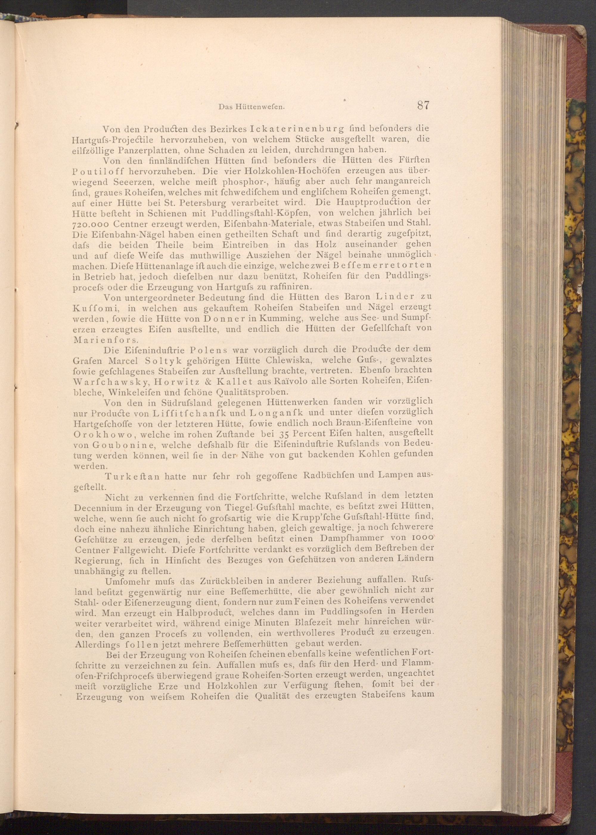 Von den Producten des Bezirkes Ickaterinenburg find befonders die Hartgufs- Projectile hervorzuheben, von welchem Stücke ausgeftellt waren, die eilfzöllige Panzerplatten, ohne Schaden zu leiden, durchdrungen haben.