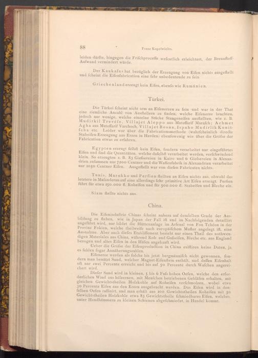 Tunis, Marokko und Perfien ftellten an Eifen nichts aus, obwohl das letztere in Mafanderan auf eine allerdings fehr primitive Art Eifen erzeugt. Perfien führt für etwa 150.000 fl. Roheifen und für 500.000 fl. Stabeifen und Bleche ein.