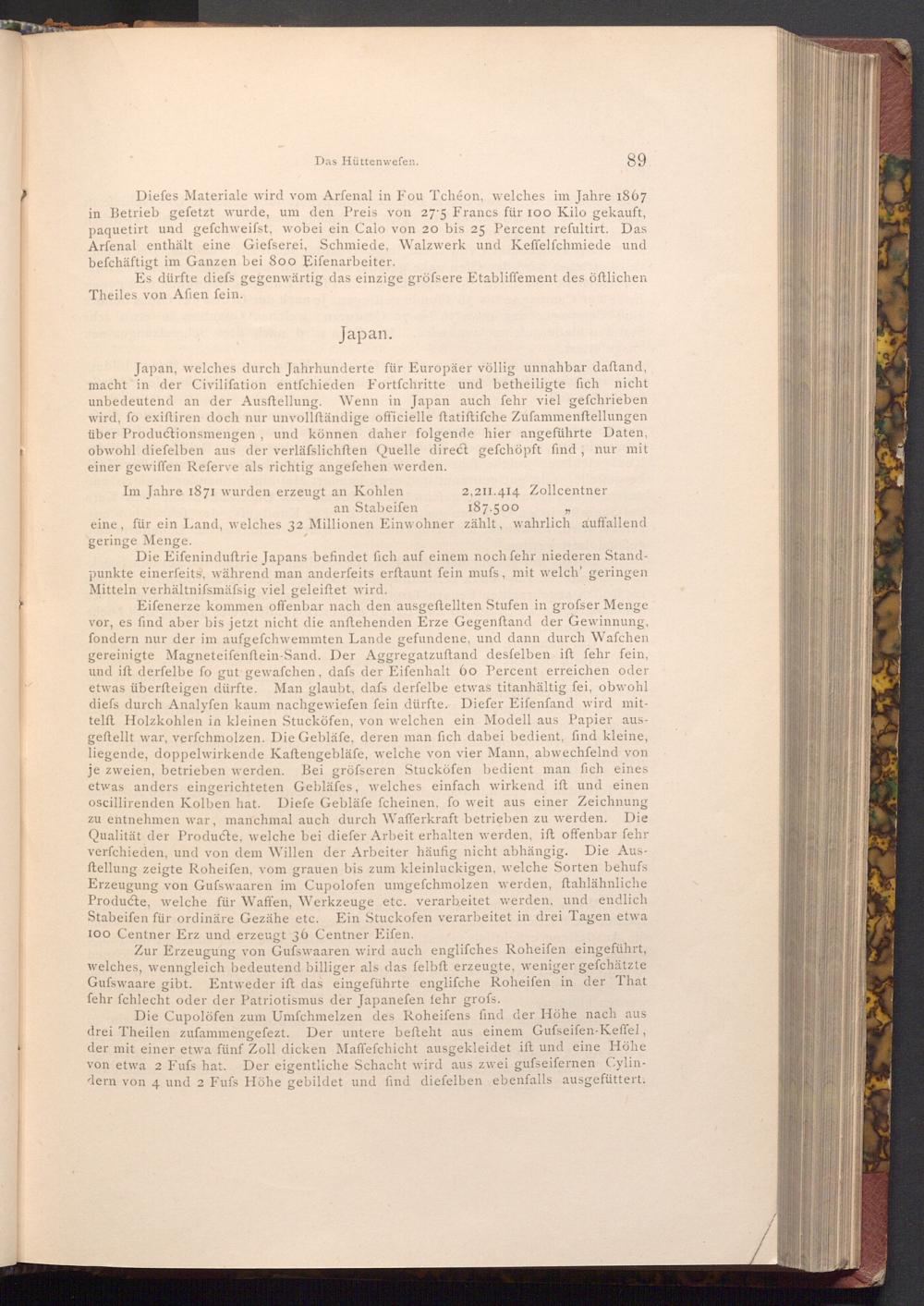 Japan, welches durch Jahrhunderte für Europäer völlig unnahbar daftand, macht in der Civilifation entfchieden Fortfchritte und betheiligte fich nicht unbedeutend an der Ausftellung. Wenn in Japan auch fehr viel gefchrieben wird, fo exiftiren doch nur unvollständige officielle ftatiftifche Zufammenftellungen über Productionsmengen, und können daher folgende hier angeführte Daten, obwohl diefelben aus der verlässlichften Quelle direct gefchöpft find, nur mit einer gewiffen Referve als richtig angefehen werden.