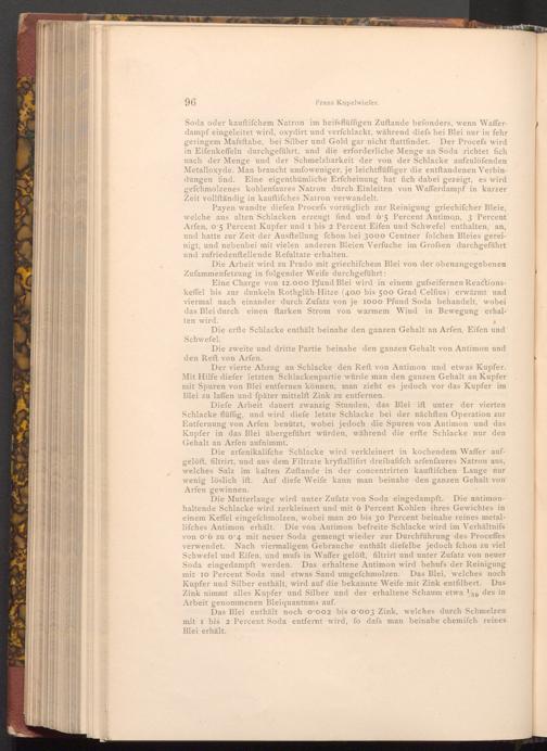 Eine Charge von 12.000 Pfund Blei wird in einem gufseifernen Reactionskeffel bis zur dunkeln Rothglüh- Hitze( 400 bis 500 Grad Celfius) erwärmt und viermal nach einander durch Zufatz von je 1000 Pfund Soda behandelt, wobei das Blei durch einen ftarken Strom von warmem Wind in Bewegung erhalten wird.