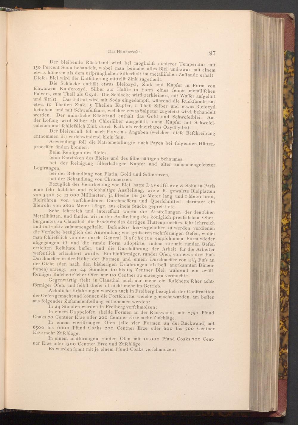 Der bleibende Rückftand wird bei möglichft niederer Temperatur mit 150 Percent Soda behandelt, wobei man beinahe alles Blei und zwar, mit einem etwas höheren als dem urfprünglichen Silberhalt im metallifchen Zuftande erhält. Diefes Blei wird der Entfilberung mittelft Zink zugetheilt.