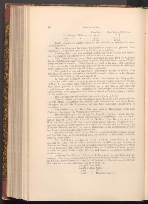 Die Gefellſchaft des Emfer Blei- und Silberwerkes zu Ems erzeugte im Jahre 1872 an Blei 21.600 Centner, an Glätte 34.200 Centner, an Silber 6100 Pfunde, und verwendet zur Entfilberung der Bleie die Zinkentfilberung und zur Reinigung der Bleie die Dampfraffination. Erwähnt mufs noch werden, dafs hier der erfte Rafchette'fche Ofen mit 12 Formen in Deutfchland in Betrieb gefetzt wurde.