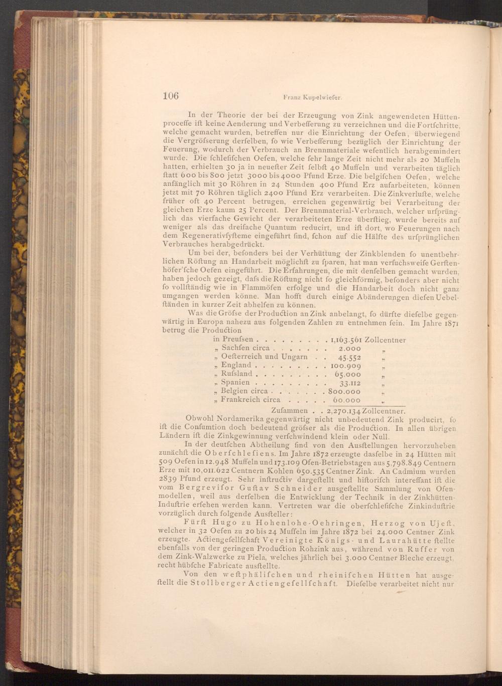Fürft Hugo zu Hohenlohe- Oehringen, Herzog von Ujeft, welcher in 32 Oefen zu 20 bis 24 Muffeln im Jahre 1872 bei 24.000 Centner Zink erzeugte. Actiengeſellſchaft Vereinigte Königs- und Laurahütte ftellte ebenfalls von der geringen Production Rohzink aus, während von Ruffer von dem Zink- Walzwerke zu Piela, welches jährlich bei 3.000 Centner Bleche erzeugt, recht hübfche Fabricate ausftellte.