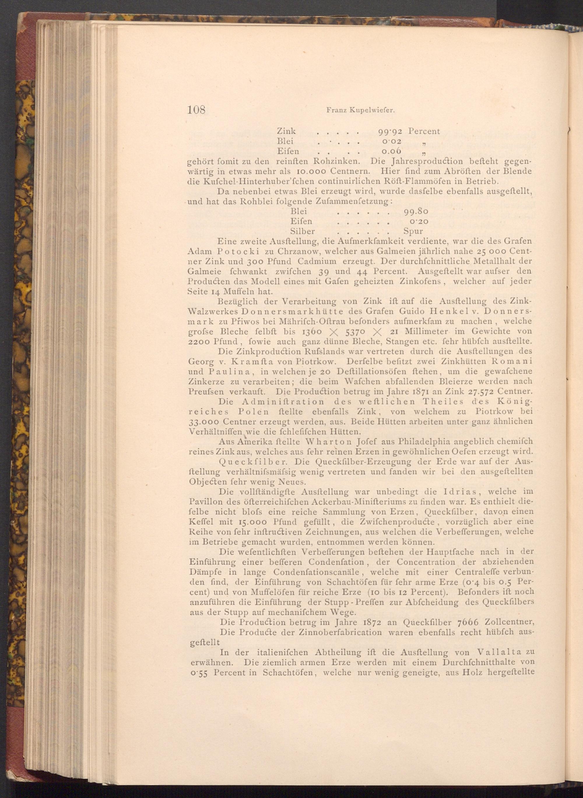 Bezüglich der Verarbeitung von Zink ift auf die Ausftellung des ZinkWalzwerkes Donnersmarkhütte des Grafen Guido Henkel v. Donnersmark zu Přiwos bei Mährifch- Oftrau befonders aufmerkfam zu machen, welche grofse Bleche felbft bis 1360 X 5370 X 21 Millimeter im Gewichte von 2200 Pfund, fowie auch ganz dünne Bleche, Stangen etc. fehr hübfch ausftellte. Die Zinkproduction Rufslands war vertreten durch die Ausftellungen des Georg v. Kram fta von Piotrkow. Derfelbe befitzt zwei Zinkhütten Romani und Paulina, in welchen je 20 Deftillationsöfen ftehen, um die gewafchene Zinkerze zu verarbeiten; die beim Wafchen abfallenden Bleierze werden nach Preufsen verkauft. Die Production betrug im Jahre 1871 an Zink 27.572 Centner. Die Adminiftration des weftlichen Theiles des Königreiches Polen ftellte ebenfalls Zink, von welchem zu Piotrkow bei 33.000 Centner erzeugt werden, aus. Beide Hütten arbeiten unter ganz ähnlichen Verhältniffen wie die fchlefifchen Hütten.