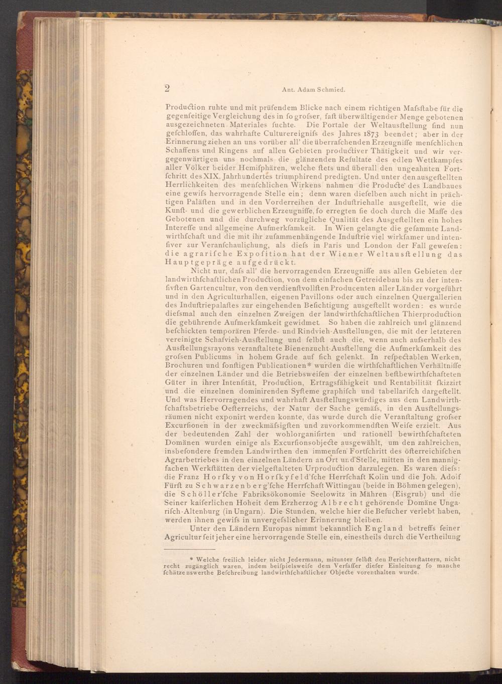 Nicht nur, dafs all' die hervorragenden Erzeugniffe aus allen Gebieten der landwirthschaftlichen Production, von dem einfachen Getreidebau bis zu der intenfivften Gartencultur, von den verdienftvollften Producenten aller Länder vorgeführt und in den Agriculturhallen, eigenen Pavillons oder auch einzelnen Quergallerien des Induftriepalaftes zur eingehenden Befichtigung ausgeftellt worden: es wurde diefsmal auch den einzelnen Zweigen der landwirthfchaftlichen Thierproduction die gebührende Aufmerkfamkeit gewidmet. So haben die zahlreich und glänzend befchickten temporären Pferde- und Rindvieh- Ausftellungen, die mit der letzteren vereinigte Schafvieh- Ausftellung und felbft auch die, wenn auch aufserhalb des Ausftellungsrayons veranstaltete Bienenzucht- Ausftellung die Aufmerkfamkeit des grofsen Publicums in hohem Grade auf fich gelenkt. In refpectablen Werken, Brochuren und fonftigen Publicationen* wurden die wirthschaftlichen Verhältniffe der einzelnen Länder und die Betriebsweifen der einzelnen beftbewirthschafteten Güter in ihrer Intenfität, Production, Ertragsfähigkeit und Rentabilität fkizzirt und die einzelnen dominirenden Syfteme graphifch und tabellarifch dargestellt. Und was Hervorragendes und wahrhaft Ausftellungswürdiges aus dem Landwirthfchaftsbetriebe Oefterreichs, der Natur der Sache gemäfs, in den Ausftellungsräumen nicht exponirt werden konnte, das wurde durch die Veranſtaltung grofser Excurfionen in der zweckmäfsigften und zuvorkommendften Weife erzielt. Aus der bedeutenden Zahl der wohlorganifirten und rationell bewirthschafteten Domänen wurden einige als Excurfionsobjecte ausgewählt, um den zahlreichen, insbefondere fremden Landwirthen den immenfen Fortfchritt des öfterreichifchen Agrarbetriebes in den einzelnen Ländern an Ort un d'Stelle, mitten in den mannigfachen Werkftätten der vielgeftalteten Urproduction darzulegen. Es waren diefs: die Franz Horfky von Horfky fel d'fche Herrfchaft Kolin und die Joh. Adoif Fürft zu Schwarzenberg'fche Herrfchaft Wittingau( beide in Böhmen gelegen), die Schöller'fche Fabriksökonomie Seelowitz in Mähren( Eisgrub) und die Seiner kaiferlichen Hoheit dem Erzherzog Albrecht gehörende Domäne Ungarifch- Altenburg( in Ungarn). Die Stunden, welche hier die Befucher verlebt haben, werden ihnen gewifs in unvergesslicher Erinnerung bleiben.