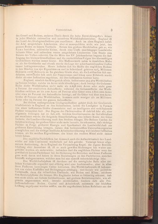 England, nämlich das Königreich allein, befitzt unter 393.569 Wirthfchaften 54 Percent folcher, welche 20 Acres nicht überfteigen; doch beträgt die Gefammtfläche diefer Wirthfchaften nicht mehr als 2,658.000 Acres oder nicht ganz 9 Percent der ermittelten Anbaufläche, während die Gefammtfläche der Wirthfchaften zwifchen 20 bis 100 Acres 28 Percent aller Güter etwa 7,810.000 Acres oder etwa 20 Percent der Anbaufläche beträgt; auf die Güter von über 100 Acres Gröfse 18 Percent aller Wirthfchaften, kommen nicht weniger als 20 Millionen Acres oder 65 Percent der ganzen Anbaufläche.