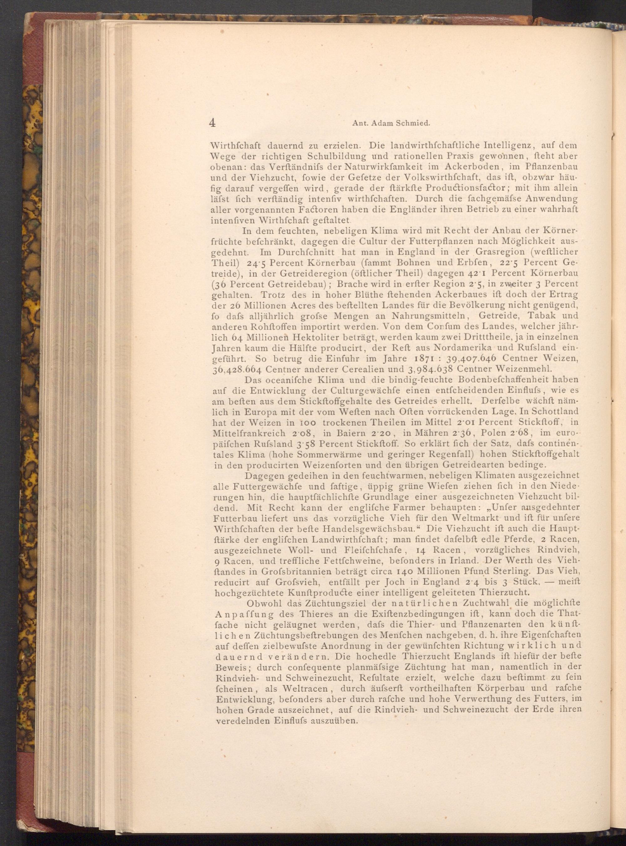 Dagegen gedeihen in den feuchtwarmen, nebeligen Klimaten ausgezeichnet alle Futtergewächfe und faftige, üppig grüne Wiefen ziehen fich in den Niederungen hin, die hauptfächlichfte Grundlage einer ausgezeichneten Viehzucht bildend. Mit Recht kann der engliſche Farmer behaupten:„ Unfer ausgedehnter Futterbau liefert uns das vorzügliche Vieh für den Weltmarkt und ift für unfere Wirthschaften der befte Handelsgewächsbau." Die Viehzucht ift auch die Hauptftärke der englifchen Landwirthschaft; man findet dafelbft edle Pferde, 2 Racen, ausgezeichnete Woll- und Fleifchfchafe, 14 Racen, vorzügliches Rindvieh, 9 Racen, und treffliche Fettfchweine, befonders in Irland. Der Werth des Viehftandes in Grofsbritannien beträgt circa 140 Millionen Pfund Sterling. Das Vieh, reducirt auf Grofsvieh, entfällt per Joch in England 24 bis 3 Stück.- meift hochgezüchtete Kunftproducte einer intelligent geleiteten Thierzucht.