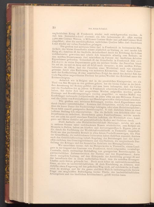 Diefe Antheils- oder Halbfcheidwirthfchaft( Metayage), welche wir auch in anderen Staaten unter verfchiedenen Namen wiederfinden, zum Beiſpiel als Mezzeria in Italien, haben am klarften und hervorragendften L. Bignon, père et fils, durch die Vorführung der Wirthfchaftsverhältniffe in Theneuille dargestellt. Nicht nur den pachtweifen Betrieb in allen feinen Productionszweigen, den Plan der Grundftücke, die verfchiedenen Culturarten haben diefelben exponirt, fondern auch den Gefellſchaftsvertrag behufs Regelung der Beziehungen und der Intereffen zwifchen den Grundeigenthümern und den Pächtern, die vergleichende Darftellung des Ertrages und die finanziellen Refultate des Metayagebetriebes.