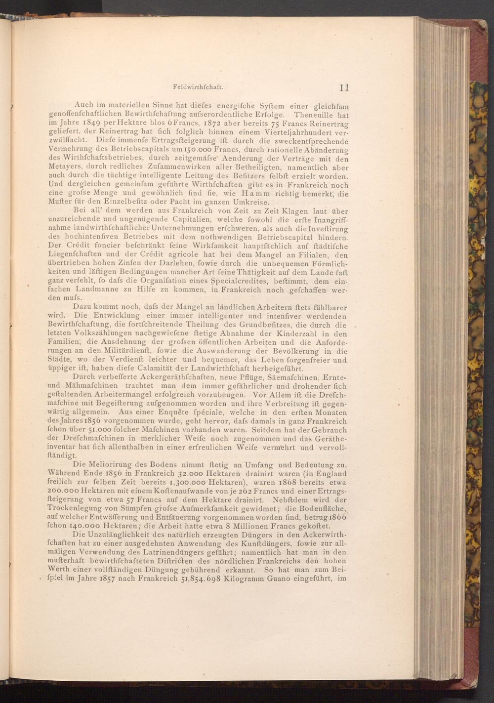 Die Meliorirung des Bodens nimmt ftetig an Umfang und Bedeutung zu. Während Ende 1856 in Frankreich 32.000 Hektaren, drainirt waren( in England freilich zur felben Zeit bereits 1,300.000 Hektaren), waren 1868 bereits etwa 200.000 Hektaren mit einem Koftenaufwande von je 262 Francs und einer Ertragsfteigerung von etwa 57 Francs auf dem Hektare drainirt. Nebftdem wird der Trockenlegung von Sümpfen grofse Aufmerkfamkeit gewidmet; die Bodenfläche, auf welcher Entwäfferung und Entfäuerung vorgenommen worden find, betrug 1866 fchon 140.000 Hektaren; die Arbeit hatte etwa 8 Millionen Francs gekoftet.