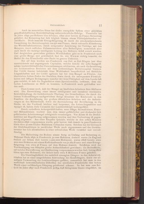 Auch im materiellen Sinne hat diefes energifche Syftem einer gleichfam genoffenfchaftlichen Bewirthfchaftung aufserordentliche Erfolge. Theneuille hat im Jahre 1849 per Hektare blos 6 Francs, 1872 aber bereits 75 Francs Reinertrag geliefert, der Reinertrag hat fich folglich binnen einem Vierteljahrhundert verzwölffacht. Diefe immenfe Ertragsfteigerung ift durch die zweckentfprechende Vermehrung des Betriebscapitals um 150.000 Francs, durch rationelle Abänderung des Wirthfchaftsbetriebes, durch zeitgemäfse' Aenderung der Verträge mit den Metayers, durch redliches Zufammenwirken aller Betheiligten, namentlich aber auch durch die tüchtige intelligente Leitung des Befitzers felbft erzielt worden. Und dergleichen gemeinfam geführte Wirthschaften gibt es in Frankreich noch eine grofse Menge und gewöhnlich find fie, wie Hamm richtig bemerkt, die Mufter für den Einzelbefitz oder Pacht im ganzen Umkreise.