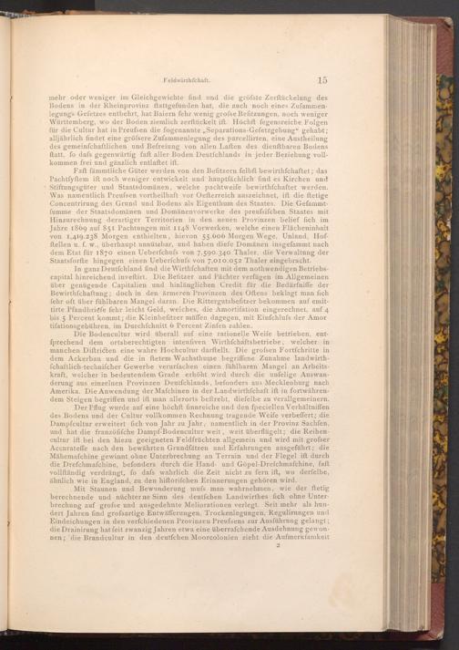 Mit Staunen und Bewunderung mufs man wahrnehmen, wie der ftetig berechnende und nüchterne Sinn des deutfchen Landwirthes fich ohne Unterbrechung auf grofse und ausgedehnte Meliorationen verlegt. Seit mehr als hundert Jahren find grofsartige Entwäfferungen, Trockenlegungen, Regulirungen und Eindeichungen in den verfchiedenen Provinzen Preufsens zur Ausführung gelangt; die Drainirung hat feit zwanzig Jahren etwa eine überrafchende Ausdehnung gewonnen; die Brandcultur in den deutfchen Moorcolonien zieht die Aufmerksamkeit