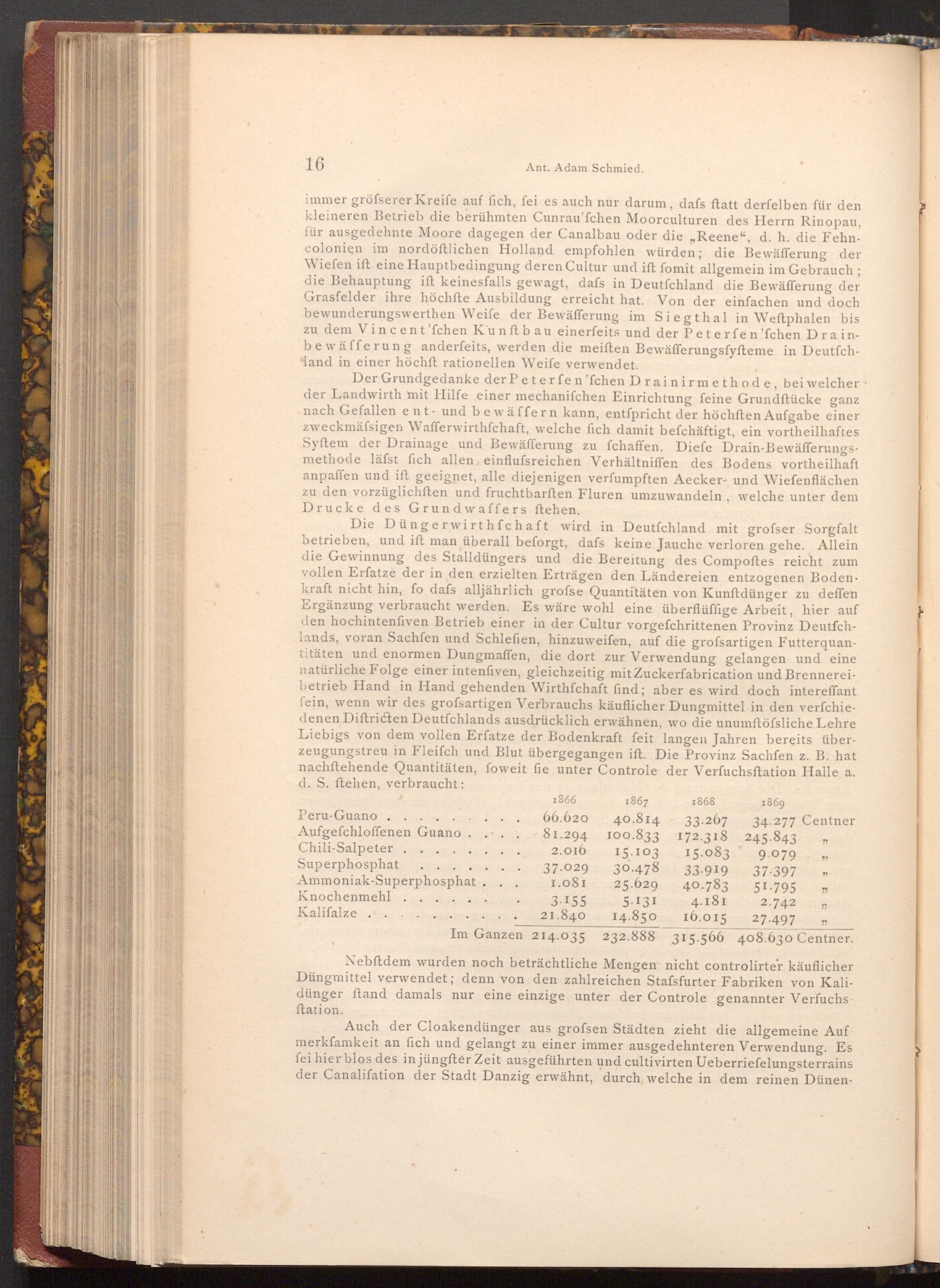 Auch der Cloakendünger aus grofsen Städten zieht die allgemeine Auf merkfamkeit an fich und gelangt zu einer immer ausgedehnteren Verwendung. Es fei hier blos des in jüngfter Zeit ausgeführten und cultivirten Ueberriefelungsterrains der Canalifation der Stadt Danzig erwähnt, durch welche in dem reinen Dünen