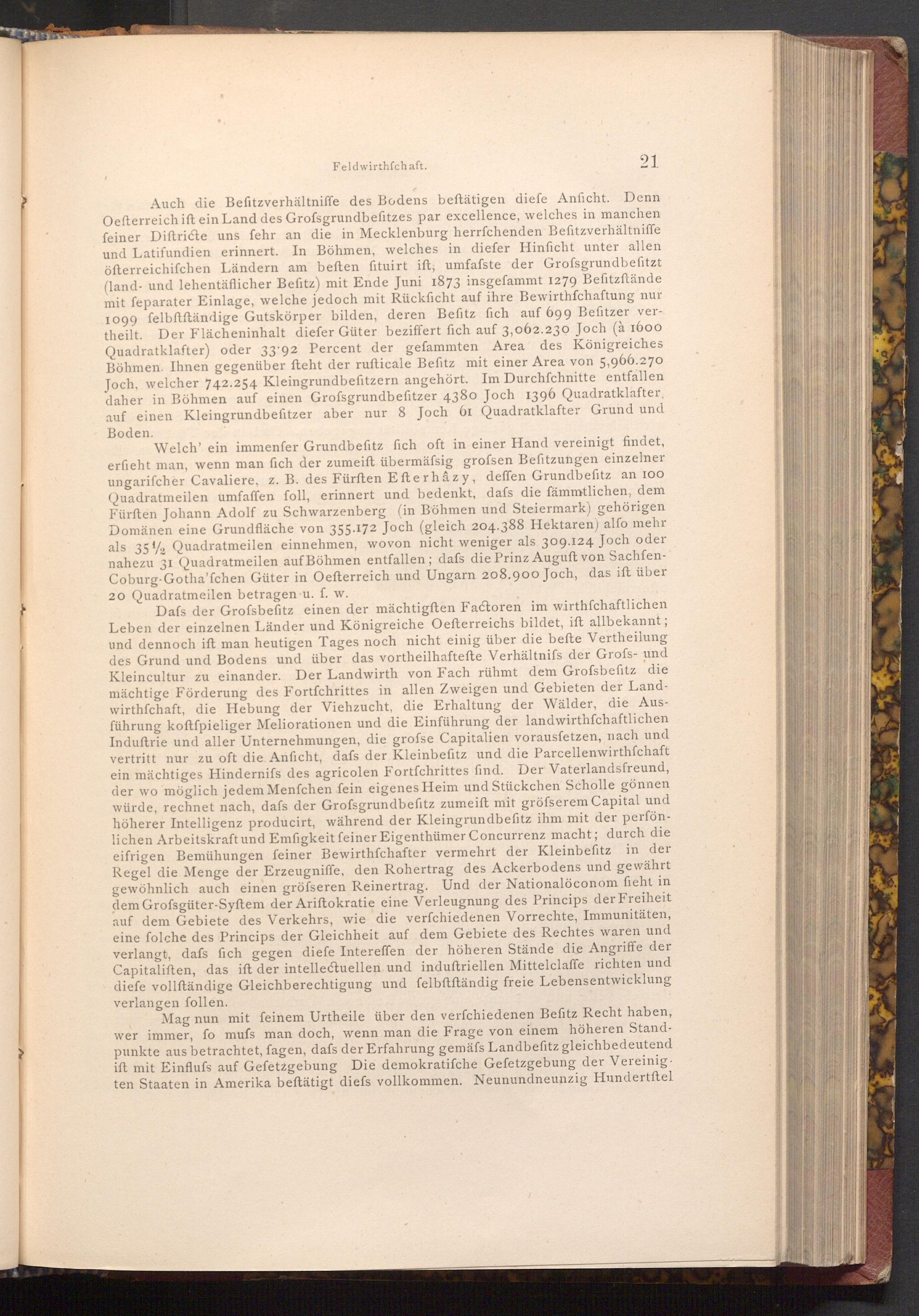 Welch' ein immenfer Grundbefitz fich oft in einer Hand vereinigt findet, erfieht man, wenn man fich der zumeift übermäfsig grofsen Befitzungen einzelner ungarifcher Cavaliere, z. B. des Fürften Efterhâzy, deffen Grundbefitz an 100 Quadratmeilen umfaffen foll, erinnert und bedenkt, dafs die fämmtlichen, dem Fürften Johann Adolf zu Schwarzenberg( in Böhmen und Steiermark) gehörigen Domänen eine Grundfläche von 355.172 Joch( gleich 204.388 Hektaren) alfo mehr als 35% Quadratmeilen einnehmen, wovon nicht weniger als 309.124 Joch oder nahezu 31 Quadratmeilen auf Böhmen entfallen; dafs die Prinz Auguft von SachfenCoburg- Gotha'fchen Güter in Oefterreich und Ungarn 208.900 Joch, das ift über 20 Quadratmeilen betragen u. f. w.