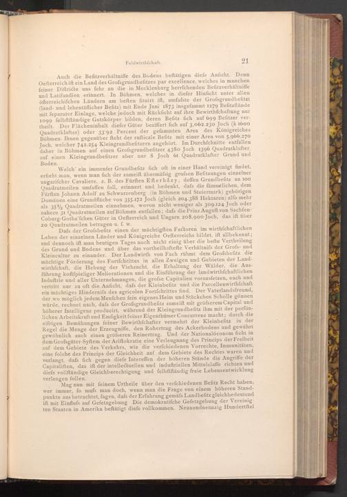 Dafs der Grofsbefitz einen der mächtigften Factoren im wirthschaftlichen Leben der einzelnen Länder und Königreiche Oefterreichs bildet, ift allbekannt; und dennoch ift man heutigen Tages noch nicht einig über die befte Vertheilung des Grund und Bodens und über das vortheilhaftefte Verhältnifs der Grofs- und Kleincultur zu einander. Der Landwirth von Fach rühmt dem Grofsbefitz die mächtige Förderung des Fortfchrittes in allen Zweigen und Gebieten der Landwirthschaft, die Hebung der Viehzucht, die Erhaltung der Wälder, die Ausführung koftfpieliger Meliorationen und die Einführung der landwirthschaftlichen Induftrie und aller Unternehmungen, die grofse Capitalien vorausfetzen, nach und vertritt nur zu oft die Anficht, dafs der Kleinbefitz und die Parcellenwirthschaft ein mächtiges Hindernifs des agricolen Fortfchrittes find. Der Vaterlandsfreund, der wo möglich jedem Menfchen fein eigenes Heim und Stückchen Scholle gönnen würde, rechnet nach, dafs der Grofsgrundbefitz zumeift mit gröfserem Capital und höherer Intelligenz producirt, während der Kleingrundbefitz ihm mit der perfönlichen Arbeitskraft und Emfigkeit feiner Eigenthümer Concurrenz macht; durch die eifrigen Bemühungen feiner Bewirthfchafter vermehrt der Kleinbefitz in der Regel die Menge der Erzeugniffe, den Rohertrag des Ackerbodens und gewährt gewöhnlich auch einen gröfseren Reinertrag. Und der Nationalöconom fieht in dem Grofsgüter- Syftem der Ariftokratie eine Verleugnung des Princips der Freiheit auf dem Gebiete des Verkehrs, wie die verfchiedenen Vorrechte, Immunitäten, eine folche des Princips der Gleichheit auf dem Gebiete des Rechtes waren und verlangt, dafs fich gegen diefe Intereffen der höheren Stände die Angriffe der Capitaliften, das ift der intellectuellen und induftriellen Mittel claffe richten und diefe vollſtändige Gleichberechtigung und felbftftändig freie Lebensentwicklung verlangen follen.