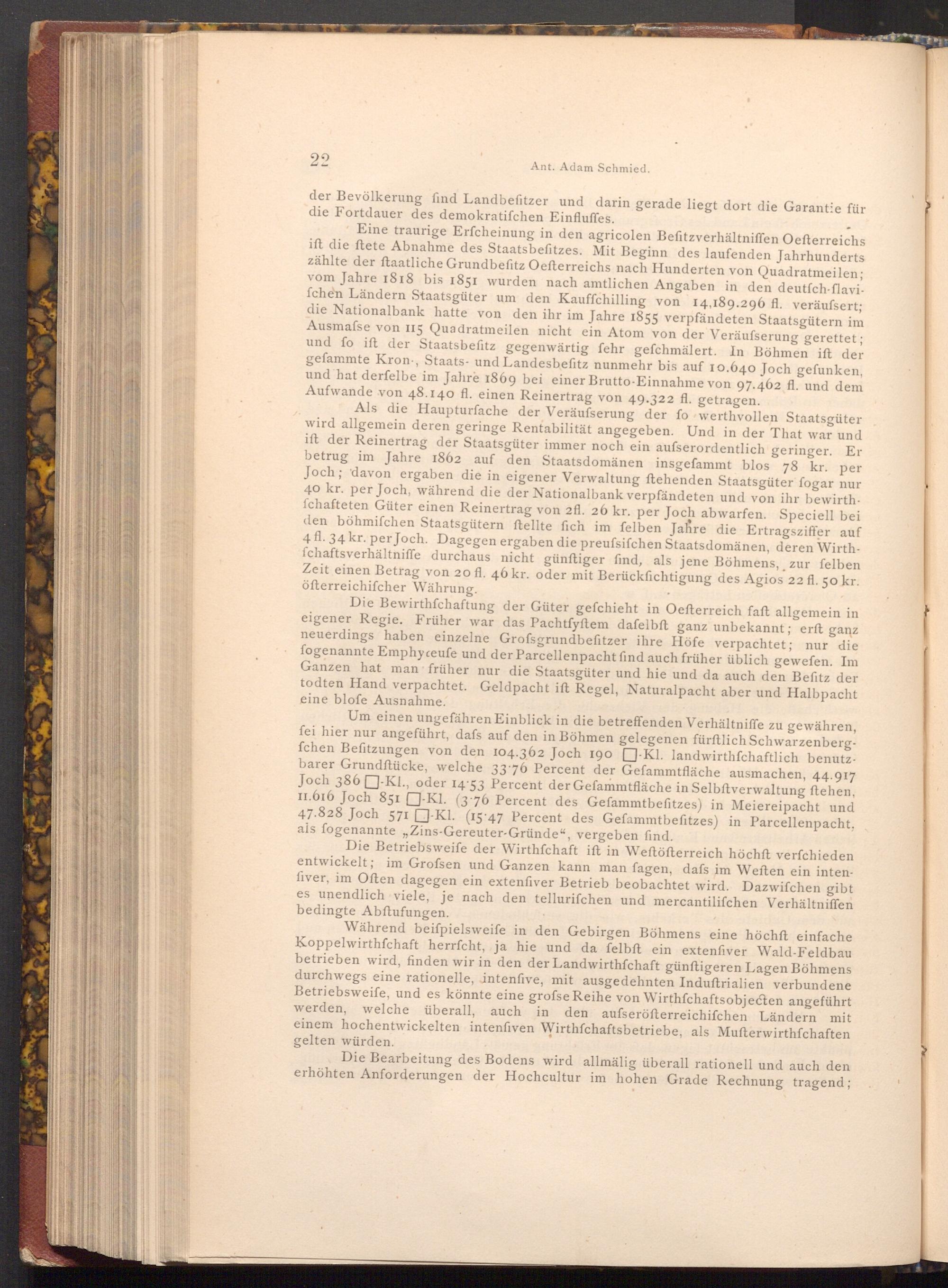 Eine traurige Erfcheinung in den agricolen Befitzverhältniffen Oefterreichs ift die ftete Abnahme des Staatsbefitzes. Mit Beginn des laufenden Jahrhunderts zählte der ftaatliche Grundbefitz Oefterreichs nach Hunderten von Quadratmeilen; vom Jahre 1818 bis 1851 wurden nach amtlichen Angaben in den deutſch- flavifchen Ländern Staatsgüter um den Kauffchilling von 14,189.296 fl. veräussert; die Nationalbank hatte von den ihr im Jahre 1855 verpfändeten Staatsgütern im Ausmafse von 115 Quadratmeilen nicht ein Atom von der Veräufserung gerettet; und fo ift der Staatsbefitz gegenwärtig fehr gefchmälert. In Böhmen ist der gefammte Kron, Staats- und Landesbefitz nunmehr bis auf 10.640 Joch gefunken, und hat derfelbe im Jahre 1869 bei einer Brutto- Einnahme von 97.462 fl. und dem Aufwande von 48.140 fl. einen Reinertrag von 49.322 fl. getragen.