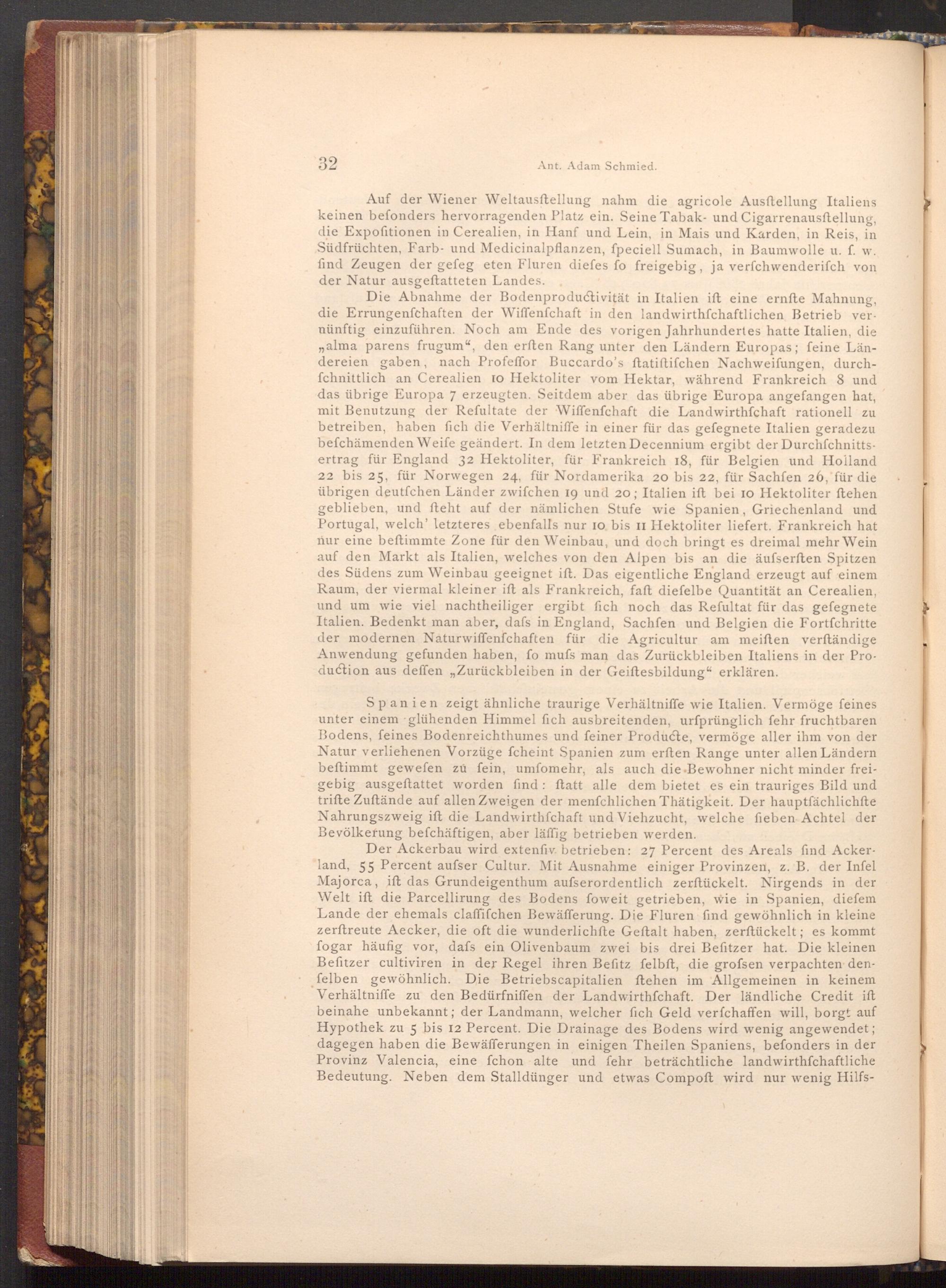 Spanien zeigt ähnliche traurige Verhältniffe wie Italien. Vermöge feines unter einem glühenden Himmel fich ausbreitenden, urfprünglich fehr fruchtbaren Bodens, feines Bodenreichthumes und feiner Producte, vermöge aller ihm von der Natur verliehenen Vorzüge fcheint Spanien zum erften Range unter allen Ländern beftimmt gewefen zu fein, umfomehr, als auch die Bewohner nicht minder freigebig ausgeftattet worden find: ftatt alle dem bietet es ein trauriges Bild und trifte Zuftände auf allen Zweigen der menfchlichen Thätigkeit. Der hauptfächlichfte Nahrungszweig ift die Landwirthschaft und Viehzucht, welche fieben Achtel der Bevölkerung befchäftigen, aber läffig betrieben werden.