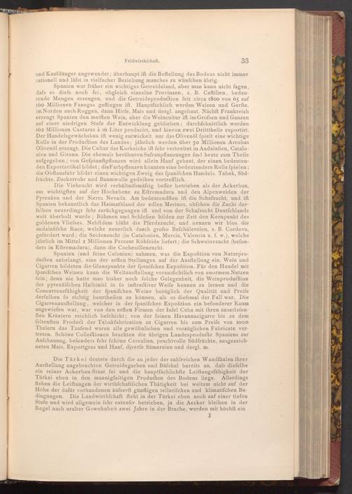 Die Türkei deutete durch die an jeder der zahlreichen Wandfäulen ihrer Ausftellung angebrachten Getreidegarben und Büfchel bereits an, dafs diefelbe ein reiner Ackerbau- Staat fei und die hauptfächlichfte Leiftungsfähigkeit der Türkei eben in den mannigfaltigen Producten des Bodens liege. Allerdings ffehen die Leiftungen der wirthfchaftlichen Thätigkeit bei weitem nicht auf der Höhe der dafür vorhandenen äufserft günftigen tellurifchen und klimatifchen Bedingungen. Die Landwirthschaft fteht in der Türkei eben noch auf einer tiefen Stufe und wird allgemein fehr extenfiv betrieben, ja die Aecker bleiben in der Regel nach uralter Gewohnheit zwei Jahre in der Brache, werden mit höchft ein