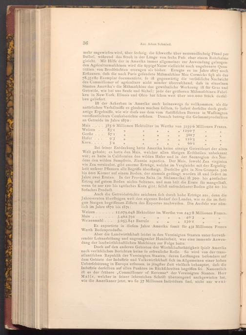 mehr angewiefen wird, über fechzig, die fchwerfte über neunundfechzig Pfund per Bufhel, während das Stroh in der Länge von fechs Fufs eher einem Rohrhalme gleicht. Mit Hilfe der in Amerika immer allgemeiner zur Anwendung gelangenden Agriculturmafchinen wird die üppige Natur vielleicht noch ungeheuere Quantitäten von Brodfrüchten erzeugen als bisher. Erregte es im Jahre 1867 noch Erftaunen, dafs die nach Paris gefendete Mähmafchine Mac Cormicks fich als das 78.351fte Exemplar documentirte, fo ift gegenwärtig die verlässliche Nachricht des Commiffioner of agriculture nicht minder überrafchend, dafs in einzelnen Staaten Amerika's die Mähmafchine das gewöhnliche Werkzeug ift für Gras und Getreide, wie bei uns Senfe und Sichel; jede der gröfseren Mähmaschinen- Fabriken in New- York, Illinois und Ohio hat fchon weit über 100.000 Stück derfelben geliefert.