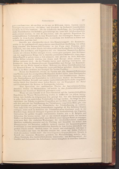 ger confumiren, als zur Zeit, wo fie nur 30 Millionen waren, fondern auch weniger exportiren, als früher, und überdiefs im Seehandel hauptfächlich fremde Schiffe benützen. Ob die induftrielle Ausftellung der Unionsftaaten diefes Rückfchreiten der Induftrie gerechtfertigt hat, kann hier felbftverſtändlich nicht erörtert werden; fo viel ift aber ficher, dafs die agricole Expofition die wirthschaftlichen Verhältniffe in dem Wunderlande der Vereinigten Staaten keinesfalls in dem Lichte erfcheinen liefs, in welchem wir diefelben zu fehen und zu betrachten gewöhnt find.