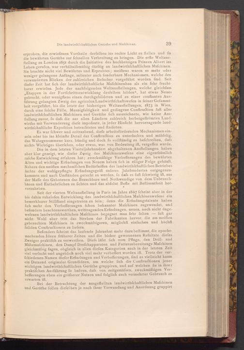 erproben, die erwiefenen Vortheile derfelben ins rechte Licht zu ftellen und for die bewährten Geräthe zur fchnellen Verbreitung zu bringen. Die erfte Weltausftellung zu London 1851 durch die Initiative des hochherzigen Prinzen Albert ins Leben gerufen, war verhältnifsmäfsig dürftig an landwirthschaftlichen Mafchinen. Sie brachte nicht viel Bewährtes und Erprobtes; meiftens waren es mehr oder weniger gelungene Anfänge, mitunter auch fonderbare Mechanismen, welche den verwunderten Blicken der zahlreichen Befucher vorgeführt worden find. Seit diefer Zeit hat fich der landwirthfchaftliche Mafchinenbau als ein fehr fruchtbarer erwiefen. Jede der nachfolgenden Weltausstellungen, welche gleichfam , Etappen in der Fortfchrittsentwicklung desfelben bilden", hat etwas Neues gebracht, oder wenigftens einen durchgebildeten und zu einer conftanten Ausführung gelangten Zweig des agricolen Landwirthfchaftswefen in feiner Gefammtheit vorgeführt, bis die letzte der bisherigen Weltausstellungen, 1873 in Wien, durch eine folche Fülle, Mannigfaltigkeit und gediegene Conftruction faft aller landwirthfchaftlichen Mafchinen und Geräthe fich auszeichnete, wie keine Ausftellung zuvor, fo dafs die aus allen Ländern zahlreich herbeigeftrömten Landwirthe mit Verwunderung diefe impofante, in jeder Hinsicht hervorragende landwirthschaftliche Expofition betrachteten und ftudirten.