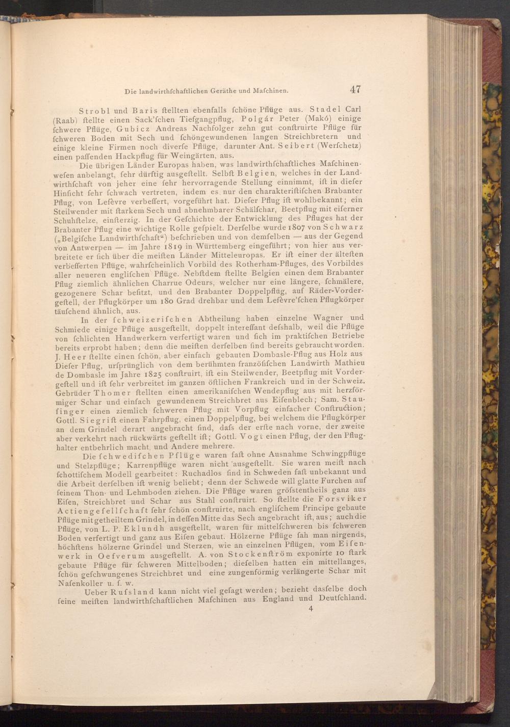 In der fchweizerifchen Abtheilung haben einzelne Wagner und Schmiede einige Pflüge ausgeftellt, doppelt intereffant defshalb, weil die Pflüge von fchlichten Handwerkern verfertigt waren und fich im praktifchen Betriebe bereits erprobt haben; denn die meiſten derfelben find bereits gebraucht worden. J. Heer ftellte einen fchön, aber einfach gebauten Dombasle- Pflug aus Holz aus Diefer Pflug, urfprünglich von dem berühmten franzöfifchen Landwirth Mathieu de Dombasle im Jahre 1825 conftruirt, ift ein Steilwender, Beetpflug mit Vordergeftell und ift fehr verbreitet im ganzen öftlichen Frankreich und in der Schweiz. Gebrüder Thomer ftellten einen amerikanifchen Wendepflug aus mit herzförmiger Schar und einfach gewundenem Streichbret aus Eifenblech; Sam. Staufinger einen ziemlich fchweren Pflug mit Vorpflug einfacher Conftruction; Gottl. Siegrift einen Fahrpflug, einen Doppelpflug, bei welchem die Pflugkörper an dem Grindel derart angebracht find, dafs der erfte nach vorne, der zweite aber verkehrt nach rückwärts geftellt ift; Gottl. Vogt einen Pflug, der den Pflughalter entbehrlich macht, und Andere mehrere.