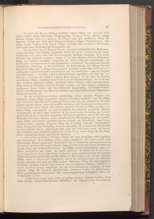 Die fchwedifchen Pflüge waren faft ohne Ausnahme Schwingpflüge und Stelzpflüge; Karrenpflüge waren nicht ausgeftellt. Sie waren meift nach fchottifchem Modell gearbeitet: Ruchadlos find in Schweden faft unbekannt und die Arbeit derfelben ift wenig beliebt; denn der Schwede will glatte Furchen auf feinem Thon- und Lehmboden ziehen. Die Pflüge waren gröfstentheils ganz aus Eifen, Streichbret und Schar aus Stahl conftruirt. So ftellte die Forsviker Actiengefellfchaft fehr fchön conftruirte, nach englifchem Principe gebaute Pflüge mitgetheiltem Grindel, in deffen Mitte das Sech angebracht ift, aus; auch die Pflüge, von L. P. Eklundh ausgeftellt, waren für mittelfchweren bis fchweren Boden verfertigt und ganz aus Eifen gebaut. Hölzerne Pflüge fah man nirgends, höchftens hölzerne Grindel und Sterzen, wie an einzelnen Pflügen, vom Eifenwerk in Oefverum ausgeftellt. A. von Stockenftröm exponirte 10 ftark gebaute Pflüge für fchweren Mittelboden; diefelben hatten ein mittellanges, fchön gefchwungenes Streichbret und eine zungenförmig verlängerte Schar mit Nafenkoller u. f. w.