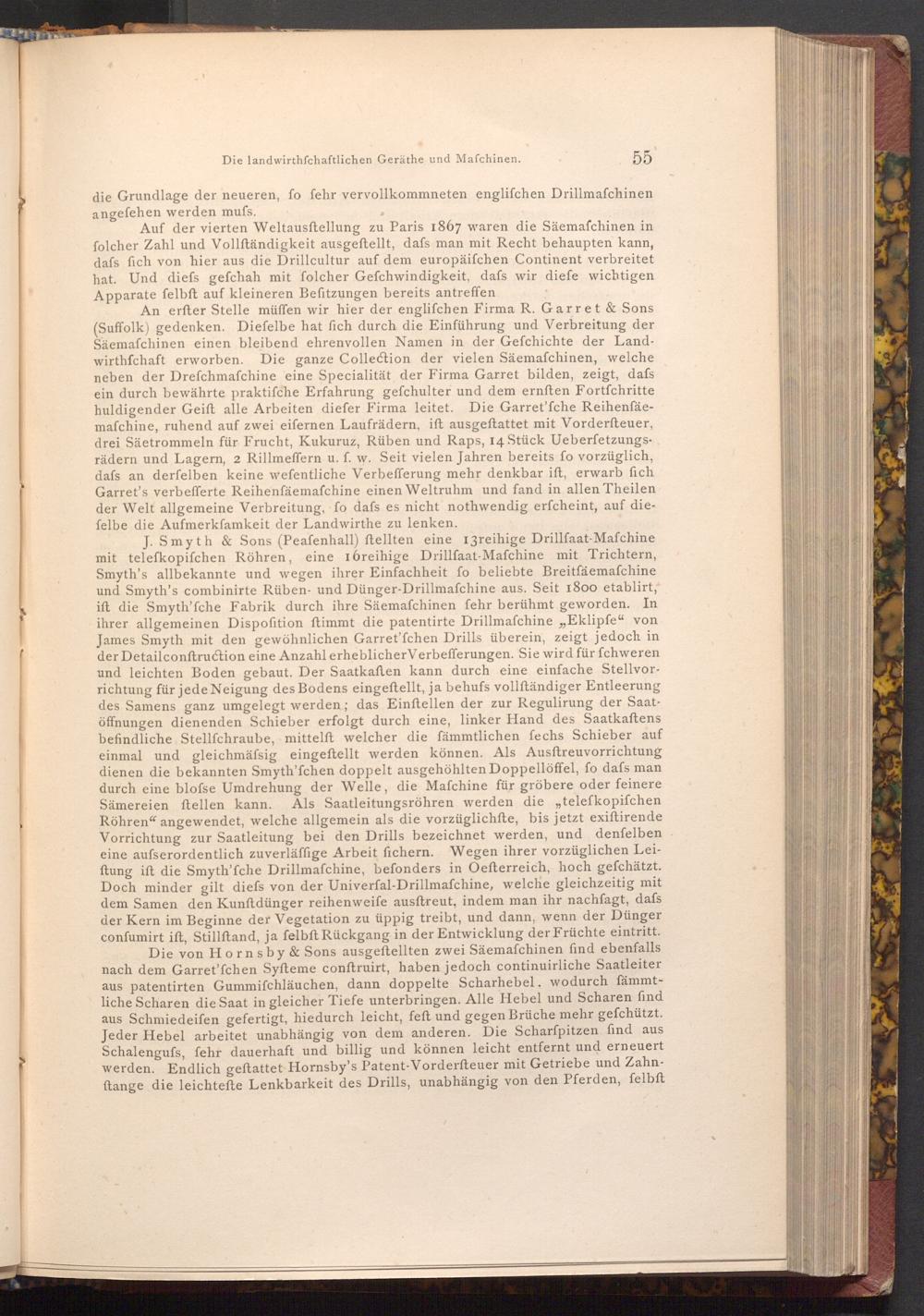 An erfter Stelle müffen wir hier der englifchen Firma R. Garret& Sons ( Suffolk) gedenken. Diefelbe hat fich durch die Einführung und Verbreitung der Säemafchinen einen bleibend ehrenvollen Namen in der Gefchichte der Landwirthfchaft erworben. Die ganze Collection der vielen Säemaſchinen, welche neben der Drefchmafchine eine Specialität der Firma Garret bilden, zeigt, dafs ein durch bewährte praktiſche Erfahrung gefchulter und dem ernften Fortfchritte huldigender Geift alle Arbeiten diefer Firma leitet. Die Garret'fche Reihenfäemafchine, ruhend auf zwei eifernen Laufrädern, ift ausgeftattet mit Vorderſteuer, drei Säetrommeln für Frucht, Kukuruz, Rüben und Raps, 14 Stück Ueberfetzungsrädern und Lagern, 2 Rillmeffern u. f. w. Seit vielen Jahren bereits fo vorzüglich, dafs an derfelben keine wefentliche Verbefferung mehr denkbar ift, erwarb fich Garret's verbefferte Reihenfäemafchine einen Weltruhm und fand in allen Theilen der Welt allgemeine Verbreitung, fo dafs es nicht nothwendig erfcheint, auf diefelbe die Aufmerkſamkeit der Landwirthe zu lenken.