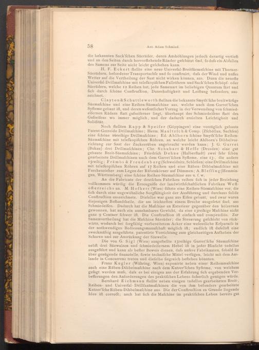 Clayton& Schuttleworth ftellten die bekannte Smyth'fche breitwürfige Säemafchine und eine Reihen- Säemafchine aus, welche nach dem Garret'fchen Syfteme gebaut ift, und deren wefentlicher Vorzug in der Verwendung von fchmiedeifernen Rädern ftatt gufseiferner liegt, überhaupt des Schmiedeifens ftatt des Gufseifens wo immer möglich, und der dadurch erzielten Leichtigkeit und Solidität.