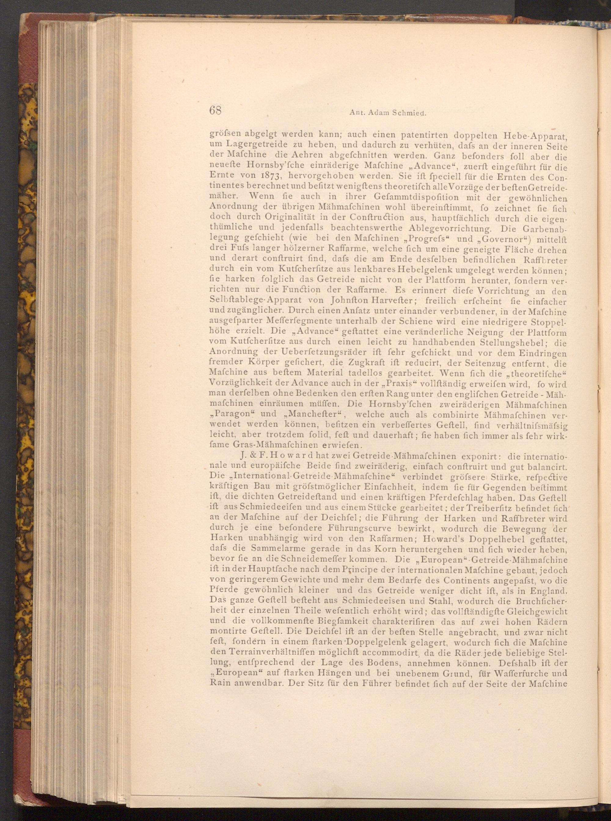 J.& F. Howard hat zwei Getreide Mähmaschinen exponirt: die internationale und europäiſche Beide find zweiräderig, einfach conftruirt und gut balancirt. Die„ International Getreide Mähmafchine" verbindet gröfsere Stärke, refpective kräftigen Bau mit gröfstmöglicher Einfachheit, indem fie für Gegenden bestimmt ift, die dichten Getreideftand und einen kräftigen Pferdefchlag haben. Das Geftell ift aus Schmiedeeifen und aus einem Stücke gearbeitet; der Treiberfitz befindet fich an der Mafchine auf der Deichfel; die Führung der Harken und Raffbreter wird durch je eine befondere Führungscurve bewirkt, wodurch die Bewegung der Harken unabhängig wird von den Raffarmen; Howard's Doppelhebel geftattet, dafs die Sammelarme gerade in das Korn heruntergehen und fich wieder heben, bevor fie an die Schneidemeffer kommen. Die European" Getreide- Mähmaschine ift in der Hauptfache nach dem Principe der internationalen Mafchine gebaut, jedoch von geringerem Gewichte und mehr dem Bedarfe des Continents angepasst, wo die Pferde gewöhnlich kleiner und das Getreide weniger dicht ift, als in England. Das ganze Geftell befteht aus Schmiedeeisen und Stahl, wodurch die Bruchficherheit der einzelnen Theile wefentlich erhöht wird; das vollständigfte Gleichgewicht und die vollkommenfte Bieg famkeit charakterifiren das auf zwei hohen Rädern montirte Geftell. Die Deichfel ift an der beften Stelle angebracht, und zwar nicht feft, fondern in einem ftarken Doppelgelenk gelagert, wodurch fich die Mafchine den Terrainverhältniffen möglichft accommodirt, da die Räder jede beliebige Stellung, entfprechend der Lage des Bodens, annehmen können. Defshalb ift der European" auf ftarken Hängen und bei unebenem Grund, für Wafferfurche und Rain anwendbar. Der Sitz für den Führer befindet fich auf der Seite der Mafchine