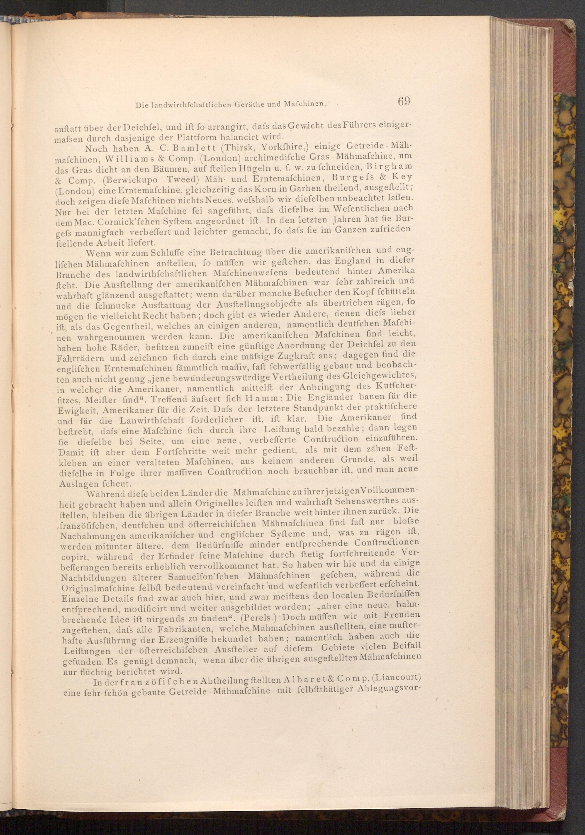 Während diefe beiden Länder die Mähmafchine zu ihrer jetzigen Vollkommenheit gebracht haben und allein Originelles leiften und wahrhaft Sehenswerthes ausftellen, bleiben die übrigen Länder in diefer Branche weit hinter ihnen zurück. Die franzöfifchen, deutfchen und öfterreichifchen Mähmaschinen find faft nur blofse Nachahmungen amerikaniſcher und englifcher Syfteme und, was zu rügen ift, werden mitunter ältere, dem Bedürfniffe minder entſprechende Conftructionen copirt, während der Erfinder feine Mafchine durch ftetig fortfchreitende Verbefferungen bereits erheblich vervollkommnet hat. So haben wir hie und da einige Nachbildungen älterer Samuelfon'fchen Mähmafchinen gefehen, während die Originalmafchine felbft bedeutend vereinfacht und wefentlich verbeffert erfcheint. Einzelne Details find zwar auch hier, und zwar meiftens den localen Bedürfniffen entſprechend, modificirt und weiter ausgebildet worden; aber eine neue, bahnbrechende Idee ift nirgends zu finden".( Perels.) Doch müffen wir mit Freuden zugeftehen, dafs alle Fabrikanten, welche Mähmafchinen ausftellten, eine mufterhafte Ausführung der Erzeugniffe bekundet haben; namentlich haben auch die Leiftungen der öfterreichifchen Ausfteller auf diefem Gebiete vielen Beifall gefunden. Es genügt demnach, wenn über die übrigen ausgeftellten Mähmaschinen nur flüchtig berichtet wird.