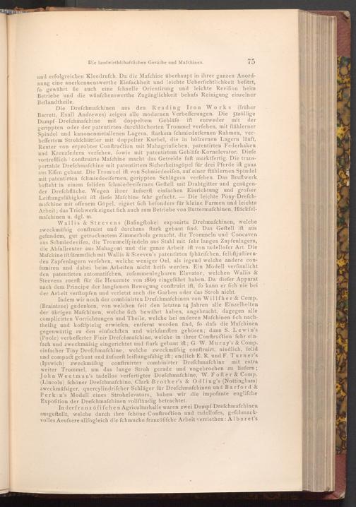 Indem wir noch der combinirten Drefchmafchinen von Willfher& Comp. ( Braintree) gedenken, von welchen feit den letzten 14 Jahren alle Einzelheiten der übrigen Mafchinen, welche fich bewährt haben, angebracht, dagegen alle complicirten Vorrichtungen und Theile, welche bei anderen Mafchinen fich nachtheilig und koftfpielig erwiefen, entfernt worden find, fo dafs die Mafchinen gegenwärtig zu den einfachften und wirkfamften gehören; dann S. Lewin's ( Poole) verbefferter Finir Drefchmafchine, welche in ihrer Conftruction fehr einfach und zweckmäfsig eingerichtet und ftark gebaut ift; G. W. Muray's& Comp. einfacher Tiny Drefchmafchine, welche zweckmäfsig conftruirt, niedlich, folid und compact gebaut und äufserft leiftungsfähig ift; endlich E. R. und F. Turner's ( Ipswich) zweckmäfsig conftruirter combinirter Drefchmafchine weiter Trommel, um das lange Stroh gerade und ungebrochen zu liefern; John Weetman's tadellos verfertigter Drefchmafchine, W. Fofter& Comp. ( Lincoln) fchöner Drefchmafchine, Clark Brother's& Odling's( Nottingham) zweckmäfsiger, quercylindrifcher Schläger für Drefchmafchinen und Barford& Perkin's Modell eines Strohelevators, haben wir die impofante englifche Expofition der Drefchmaschinen vollſtändig betrachtet.
