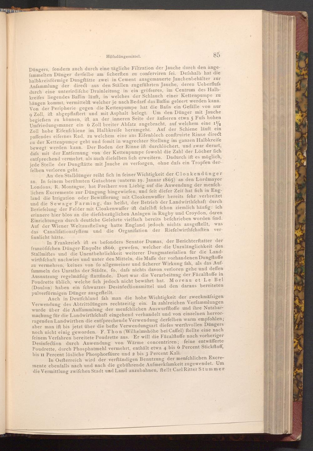 An den Stalldünger reiht fich in feiner Wichtigkeit der Cloakendünger an. In feinem berühmten Gutachten( unterm 19. Januar 1865) an den Lordmayor Londons, R. Montague, hat Freiherr von Liebig auf die Anwendung der menfchlichen Excremente zur Düngung hingewiefen, und feit diefer Zeit hat fich in England die Irrigation oder Bewäfferung mit Cloakenwaffer bereits fehr verbreitet und die Sewage Farming, das heifst, der Betrieb der Landwirthschaft durch Beriefelung der Felder mit Cloakenwaffer ift dafelbft fchon ziemlich häufig: ich erinnere hier blos an die diefsbezüglichen Anlagen in Rugby und Croydon, deren Einrichtungen durch deutfche Gelehrte vielfach bereits befchrieben worden find. Auf der Wiener Weltausftellung hatte England jedoch nichts ausgeftellt, was das Canalifationsfyftem und die Organiſation der Riefelwirthschaften finnlicht hätte.
