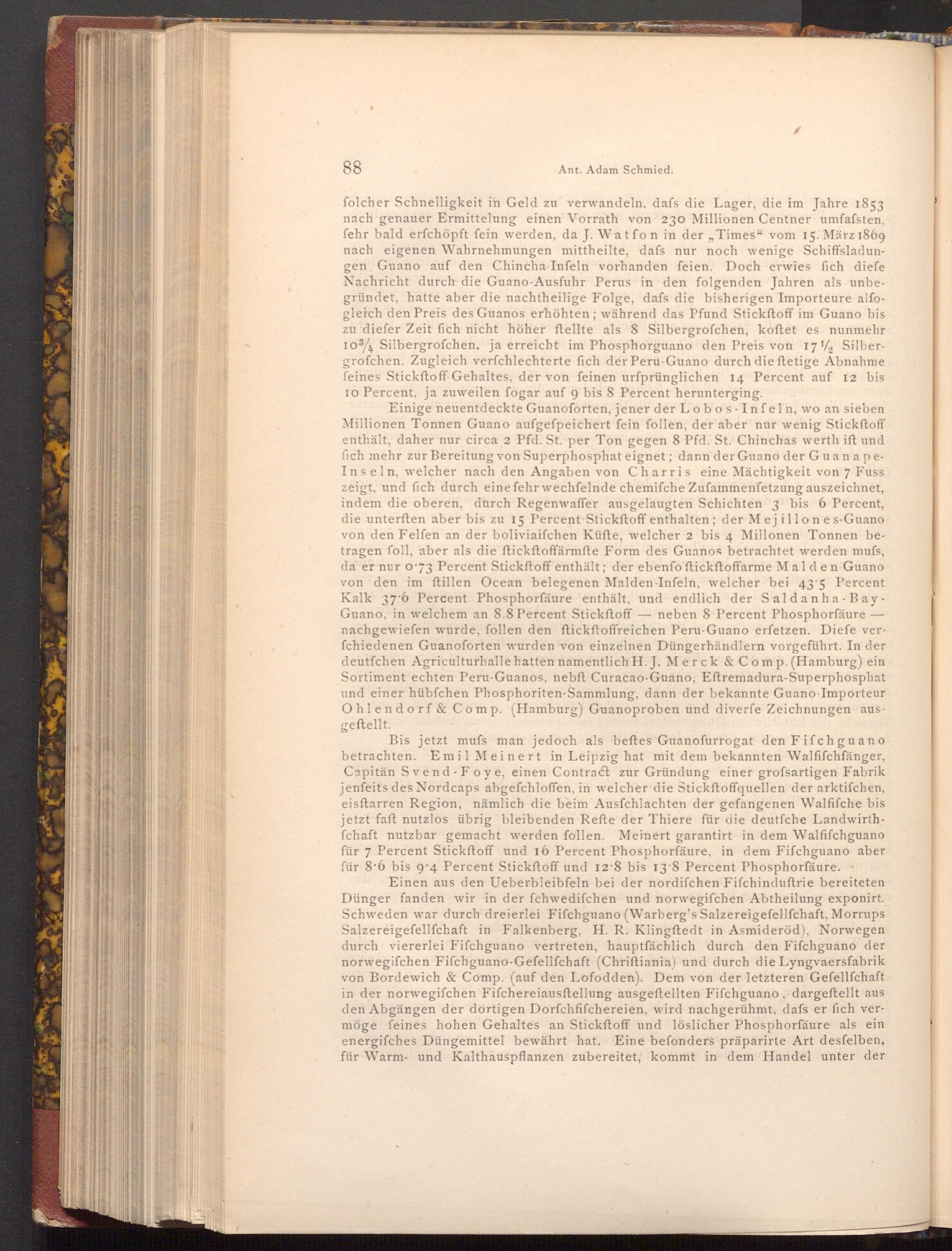 Bis jetzt mufs man jedoch als beftes Guanofurrogat den Fifchguano betrachten. Emil Meinert in Leipzig hat mit dem bekannten Walfifchfänger, Capitän Svend Foye, einen Contract zur Gründung einer grofsartigen Fabrik jenfeits des Nordcaps abgefchloffen, in welcher die Stickftoffquellen der arktifchen, eisftarren Region, nämlich die beim Ausfchlachten der gefangenen Walfifche bis jetzt faft nutzlos übrig bleibenden Refte der Thiere für die deutfche Landwirthfchaft nutzbar gemacht werden follen. Meinert garantirt in dem Walfifchguano für 7 Percent Stickftoff und 16 Percent Phosphorfäure, in dem Fifchguano aber für 8.6 bis 9.4 Percent Stickftoff und 12.8 bis 13.8 Percent Phosphorfäure.