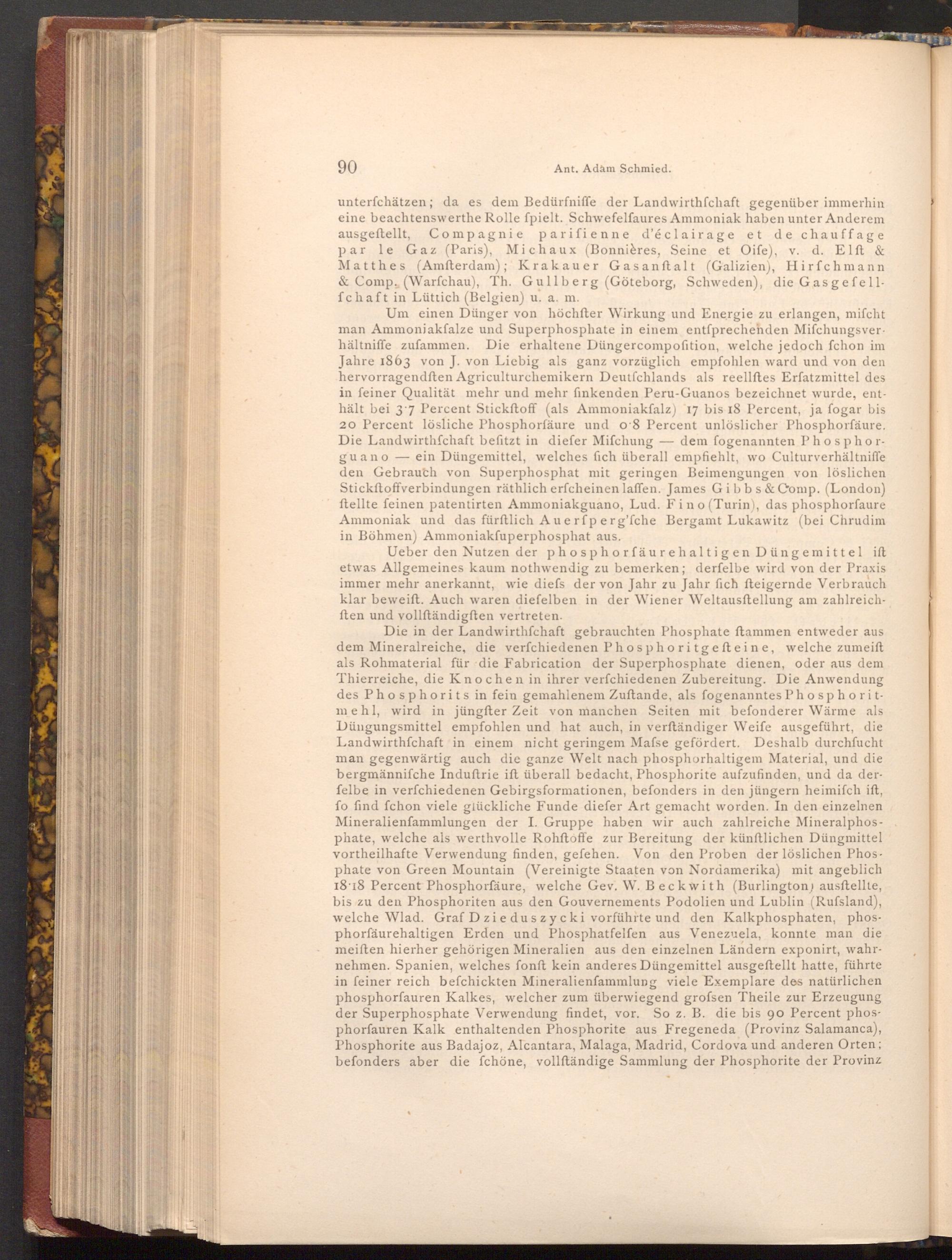 Die in der Landwirthschaft gebrauchten Phosphate ftammen entweder aus dem Mineralreiche, die verfchiedenen Phosphoritgefteine, welche zumeift als Rohmaterial für die Fabrication der Superphosphate dienen, oder aus dem Thierreiche, die Knochen in ihrer verfchiedenen Zubereitung. Die Anwendung des Phosphorits in fein gemahlenem Zuftande, als fogenanntes Phosphoritmehl, wird in jüngfter Zeit von manchen Seiten mit befonderer Wärme als Düngungsmittel empfohlen und hat auch, in verftändiger Weife ausgeführt, die Landwirthschaft in einem nicht geringem Mafse gefördert. Deshalb durchfucht man gegenwärtig auch die ganze Welt nach phosphorhaltigem Material, und die bergmännifche Induſtrie ift überall bedacht, Phosphorite aufzufinden, und da derfelbe in verfchiedenen Gebirgsformationen, befonders in den jüngern heimifch ift, fo find fchon viele glückliche Funde diefer Art gemacht worden. In den einzelnen Mineralienfammlungen der I. Gruppe haben wir auch zahlreiche Mineralphosphate, welche als werthvolle Rohftoffe zur Bereitung der künftlichen Düngmittel vortheilhafte Verwendung finden, gefehen. Von den Proben der löslichen Phosphate von Green Mountain( Vereinigte Staaten von Nordamerika) mit angeblich 18 18 Percent Phosphorfäure, welche Gev. W. Beckwith( Burlington) ausftellte, bis zu den Phosphoriten aus den Gouvernements Podolien und Lublin( Rufsland), welche Wlad. Graf Dziedus zycki vorführte und den Kalkphosphaten, phosphorfäurehaltigen Erden und Phosphatfelfen aus Venezuela, konnte man die meiften hierher gehörigen Mineralien aus den einzelnen Ländern exponirt, wahrnehmen. Spanien, welches fonft kein anderes Düngemittel ausgeftellt hatte, führte in feiner reich befchickten Mineralienfammlung viele Exemplare des natürlichen phosphorfauren Kalkes, welcher zum überwiegend grofsen Theile zur Erzeugung der Superphosphate Verwendung findet, vor. So z. B. die bis 90 Percent phosphorfauren Kalk enthaltenden Phosphorite aus Fregeneda( Provinz Salamanca), Phosphorite aus Badajoz, Alcantara, Malaga, Madrid, Cordova und anderen Orten; befonders aber die fchöne, vollſtändige Sammlung der Phosphorite der Provinz