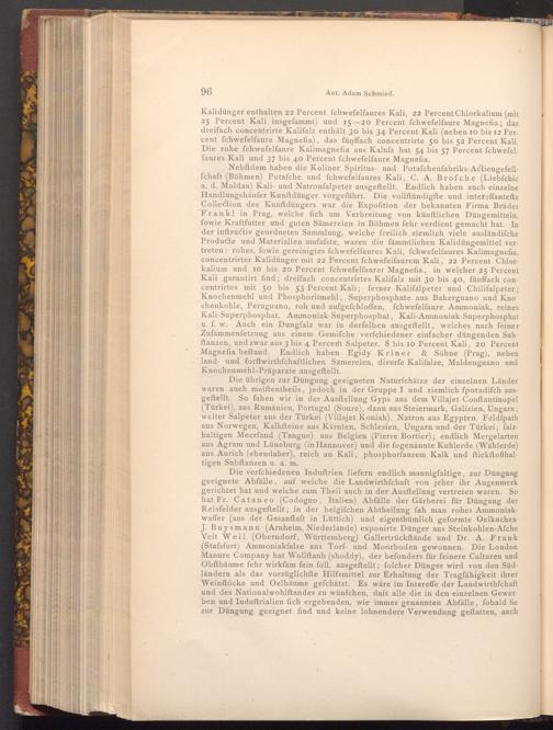Nebftdem haben die Koliner Spiritus- und Potafchenfabriks. Actiengefellfchaft( Böhmen) Potafche und fchwefelfaures Kali, C. A. Brofche( Liebfchic a. d. Moldau) Kali- und Natronfalpeter ausgeftellt. Endlich haben auch einzelne Handlungshäufer Kunftdünger vorgeführt. Die vollſtändigfte und intereffantefte Collection des Kunftdüngers war die Expofition der bekannten Firma Brüder Frankl in Prag, welche fich um Verbreitung von künftlichen Düngemitteln, fowie Kraftfutter und guten Sämereien in Böhmen fehr verdient gemacht hat. In der inftructiv geordneten Sammlung, welche freilich ziemlich viele ausländifche Producte und Materialien umfafste, waren die fämmtlichen Kalidüngemittel vertreten rohes, fowie gereinigtes fchwefelfaures Kali, fchwefelfaures Kalimagnefia, concentrirter Kalidünger mit 22 Percent fchwefelfaurem Kali, 22 Percent Chlorkalium und 10 bis 20 Percent fchwefelfaurer Magnefia, in welcher 25 Percent Kali garantirt find; dreifach concentrirtes Kalifalz mit 30 bis 40, fünffach concentrirtes mit 50 bis 53 Percent Kali; ferner Kalifalpeter und Chilifalpeter; Knochenmehl und Phosphoritmehl, Superphosphate aus Bakerguano und Kno chenkohle, Peruguano, roh und aufgefchloffen, ſchwefelfaure Ammoniak, reines Kali- Superphosphat, Ammoniak- Superphosphat, Kali- Ammoniak- Superphosphat u. f. w. Auch ein Dungfalz war in derfelben ausgeftellt, welches nach feiner Zufammenfetzung aus einem Gemifche verfchiedener einfacher düngenden Subftanzen, und zwar aus 3 bis 4 Percent Salpeter, 8 bis 10 Percent Kali, 20 Percent Magnefia beftand. Endlich haben Egidy Kriner& Söhne( Prag), neben land- und forftwirthschaftlichen Sämereien, diverfe Kalifalze, Maldenguano und Knochenmehl- Präparate ausgeftellt.