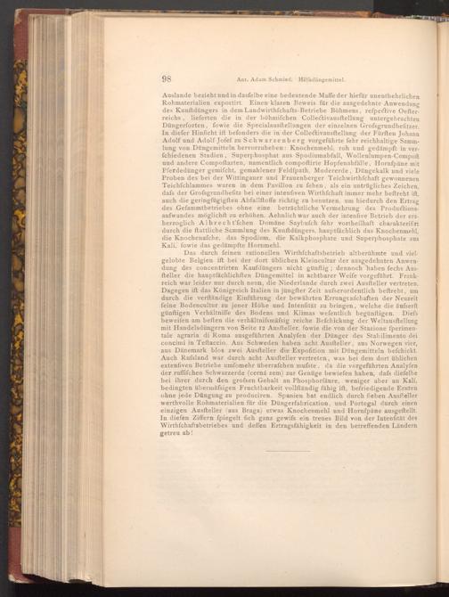 Auslande bezieht und in dasfelbe eine bedeutende Maffe der hiefür unentbehrlichen Rohmaterialien exportirt. Einen klaren Beweis für die ausgedehnte Anwendung des Kunftdüngers in dem Landwirthfchafts- Betriebe Böhmens, refpective Oefterreichs, lieferten die in der böhmifchen Collectivausftellung untergebrachten Düngerforten, fowie die Specialausftellungen der einzelnen Grofsgrundbefitzer. In diefer Hinficht ift befonders die in der Collectivausftellung der Fürften Johann Adolf und Adolf Jofef zu Schwarzenberg vorgeführte fehr reichhaltige Sammlung von Düngemitteln hervorzuheben: Knochenmehl, roh und gedämpft in verfchiedenen Stadien, Superphosphat aus Spodiumabfall, Wollenlumpen- Compoft und andere Compoftarten, namentlich compoftirte Hopfenabfälle, Hornfpäne mit Pferdedünger gemifcht, gemahlener Feldfpath, Modererde, Düngekalk und viele Proben des bei der Wittingauer und Frauenberger Teichwirthfchaft gewonnenen Teichfchlammes waren in dem Pavillon zu fehen, als ein untrügliches Zeichen, dafs der Grofsgrundbefitz bei einer intenfiven Wirthfchaft immer mehr beftrebt ift, auch die geringfügigften Abfallftoffe richtig zu benutzen, um hiedurch den Ertrag des Gefammtbetriebes ohne eine beträchtliche Vermehrung des Productionsaufwandes möglichft zu erhöhen. Aehnlich war auch der intenfive Betrieb der erzherzoglich Albrecht'fchen Domäne Saybufch fehr vortheilhaft charakterifirt durch die ftattliche Sammlung des Kunftdüngers, hauptfächlich das Knochenmehl, die Knochenafche, das Spodium, die Kalkphosphate und Superphosphate aus Kali, fowie das gedämpfte Hornmehl.
