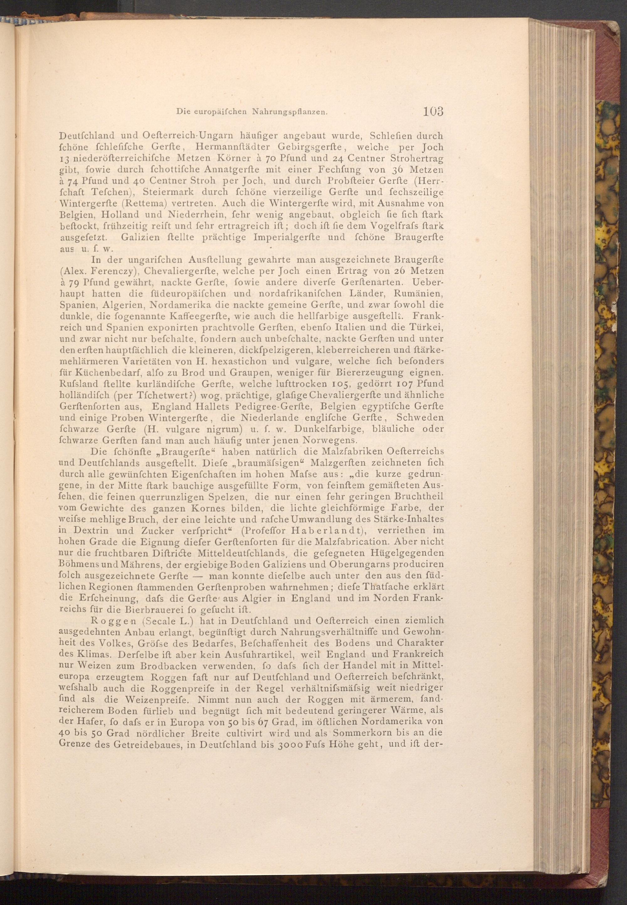 Roggen( Secale L.) hat in Deutfchland und Oefterreich einen ziemlich ausgedehnten Anbau erlangt, begünftigt durch Nahrungsverhältniffe und Gewohnheit des Volkes, Gröfse des Bedarfes, Befchaffenheit des Bodens und Charakter des Klimas. Derfelbe ift aber kein Ausfuhrartikel, weil England und Frankreich nur Weizen zum Brodbacken verwenden, fo dafs fich der Handel mit in Mitteleuropa erzeugtem Roggen faft nur auf Deutfchland und Oefterreich befchränkt, wefshalb auch die Roggenpreife in der Regel verhältnifsmäfsig weit niedriger find als die Weizenpreife. Nimmt nun auch der Roggen mit ärmerem, fand. reicherem Boden fürlieb und begnügt fich mit bedeutend geringerer Wärme, als der Hafer, fo dafs er in Europa von 50 bis 67 Grad, im öftlichen Nordamerika von 40 bis 50 Grad nördlicher Breite cultivirt wird und als Sommerkorn bis an die Grenze des Getreidebaues, in Deutfchland bis 3000 Fufs Höhe geht, und ift der