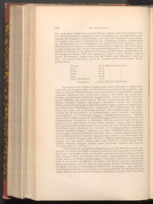 Wenn auch die ausgeftellten Roggenarten fich fehr ähnelten und nur hinfichtlich der Gröfse und Länge der Körner und ihrer Färbung, fowie in der Dicke und Länge der Aehren etwas von einander unterfchieden waren, indem z. B. einzelne Roggenproben aus Sachfen recht dunkle, blaufchimmernde, mitunter faft braune Körner des Pirnaer Gebirgsroggens eingemifcht enthielten, fo konnte man doch in der Gröfse des Halmes, der Blätter und Aehren gröfsere Verfchiedenheiten wahrnehmen, wie wir diefs an dem langen, ftarken und zähen Halme des Probfteier, den fchwer herabhängenden Aehren des Champagners, der ungewöhnlichen Länge des Strohes des Campiners, den breiten Blättern des ruffifchen und den langen Aehren des fchwedifchen Roggens wahrnehmen konnten. Aber die gröfste