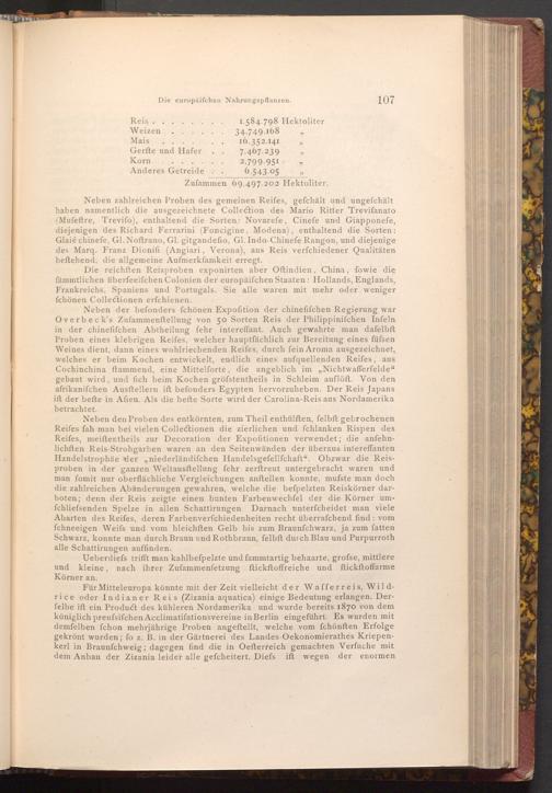 Neben der befonders fchönen Expofition der chinefifchen Regierung war Overbeck's Zufammenftellung von 50 Sorten Reis der Philippinifchen Infeln in der chinefifchen Abtheilung fehr intereffant. Auch gewahrte man dafelbft Proben eines klebrigen Reifes, welcher hauptfächlich zur Bereitung eines füfsen Weines dient, dann eines wohlriechenden Reifes, durch fein Aroma ausgezeichnet, welches er beim Kochen entwickelt, endlich eines aufquellenden Reifes, aus Cochinchina ftammend, eine Mittelforte, die angeblich im„ Nichtwafferfelde" gebaut wird, und fich beim Kochen gröfstentheils in Schleim auflöft. Von den afrikanifchen Ausftellern ift befonders Egypten hervorzuheben. Der Reis Japans ift der befte in Afien. Als die befte Sorte wird der Carolina- Reis aus Nordamerika betrachtet.