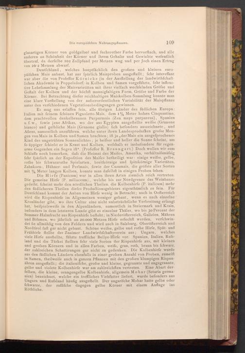 109 glasartigen Körner von goldgelber und fuchsrother Farbe hervorftach, und alle anderen an Schönheit der Körner und ihrem Gehalte und Gewichte wefentlich. übertraf, da derfelbe 102 Zollpfund per Metzen wog und per Joch einen Ertrag von 26.2 Metzen abwarf.
