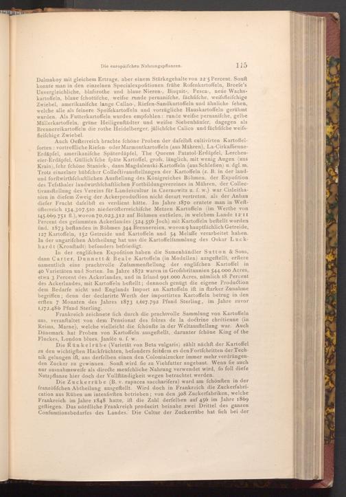 115 Dalmakoy mit gleichem Ertrage, aber einem Stärkegehalte von 22 5 Percent. Sonft konnte man in den einzelnen Specialexpofitionen frühe Rofenkartoffeln, Breefe's Unvergleichliche, blafsrothe und blaue Nieren-, Bisquit-, Pesca, neue Wachskartoffeln, blaue fchottifche, weifse runde peruanifche, fächfifche, weifsfleifchige Zwiebel, amerikaniſche lange Callao-, Riefen- Sandkartoffeln und ähnliche fehen, welche alle als feinere Speifekartoffeln und vorzügliche Hauskartoffeln gerühmt wurden. Als Futterkartoffeln wurden empfohlen: runde weifse peruanifche, gelbe Müllerkartoffeln, grüne Heiligenftädter und weifse Siebenhäufer, dagegen als Brennereikartoffeln die rothe Heidelberger, jülichfche Calico und fächfifche weissfleifchige Zwiebel.