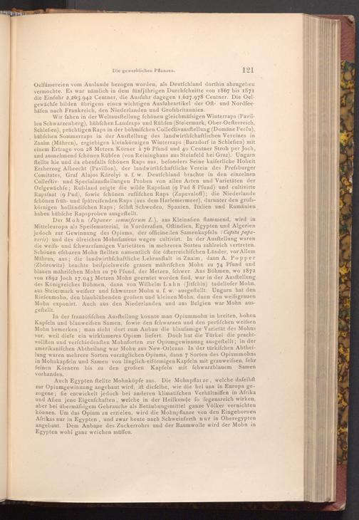 Auch Egypten ftellte Mohnköpfe aus. Die Mohnpflarze, welche dafelbft zur Opiumgewinnung angebaut wird, ift diefelbe, wie die bei uns in Europa gezogene; fie entwickelt jedoch bei anderen klimatifchen Verhältniffen in Afrika und Afien jene Eigenfchaften, welche in der Heilkunde fo fegensreich wirken, aber bei übermäfsigem Gebrauche als Betäubungsmittel ganze Völker vernichten können. Um das Opium zu erzielen, wird die Mohnpflanze von den Eingebornen Afrikas nur in Egypten, und zwar heute nach Schweinfurth nur in Oberegypten angebaut. Dem Anbaue des Zuckerrohrs und der Baumwolle wird der Mohn in Egypten wohl ganz weichen müffen.
