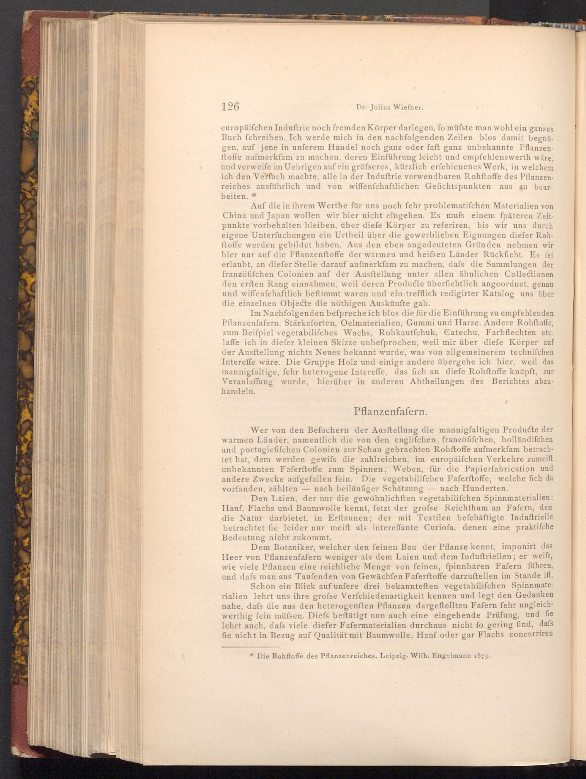 Im Nachfolgenden befpreche ich blos die für die Einführung zu empfehlenden Pflanzenfafern, Stärkeforten, Oelmaterialien, Gummi und Harze. Andere Rohftoffe, zum Beiſpiel vegetabilifches Wachs, Rohkautfchuk, Catechu, Farbflechten etc. laffe ich in diefer kleinen Skizze unbefprochen, weil mir über diefe Körper auf der Ausftellung nichts Neues bekannt wurde, was von allgemeinerem technifchen Intereffe wäre. Die Gruppe Holz und einige andere übergehe ich hier, weil das mannigfaltige, fehr heterogene Intereffe, das fich an diefe Rohftoffe knüpft, zur Veranlaffung wurde, hierüber in anderen Abtheilungen des Berichtes abzuhandeln.